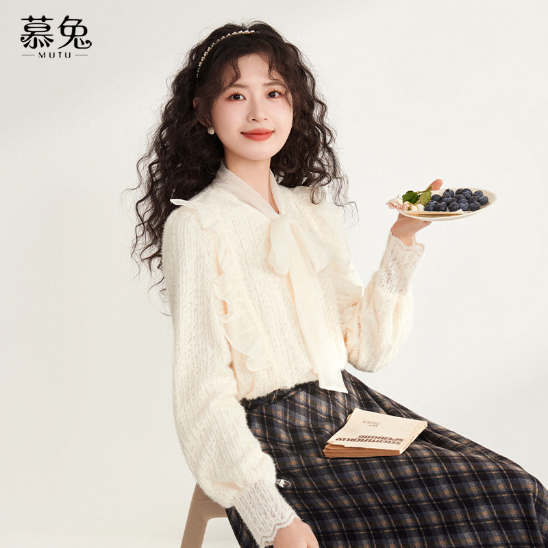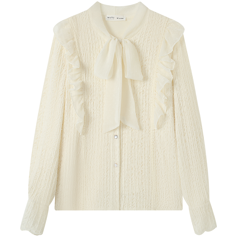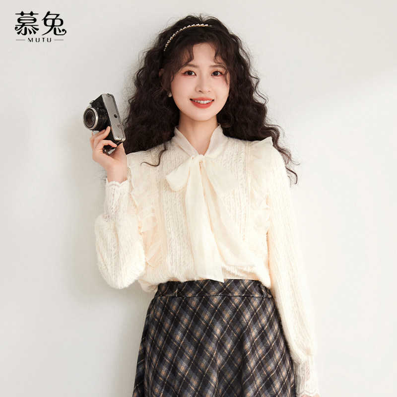 📚 慕兔法式长袖衬衫女冬2025新款加厚蝴蝶结系带内搭打底衫加绒上衣