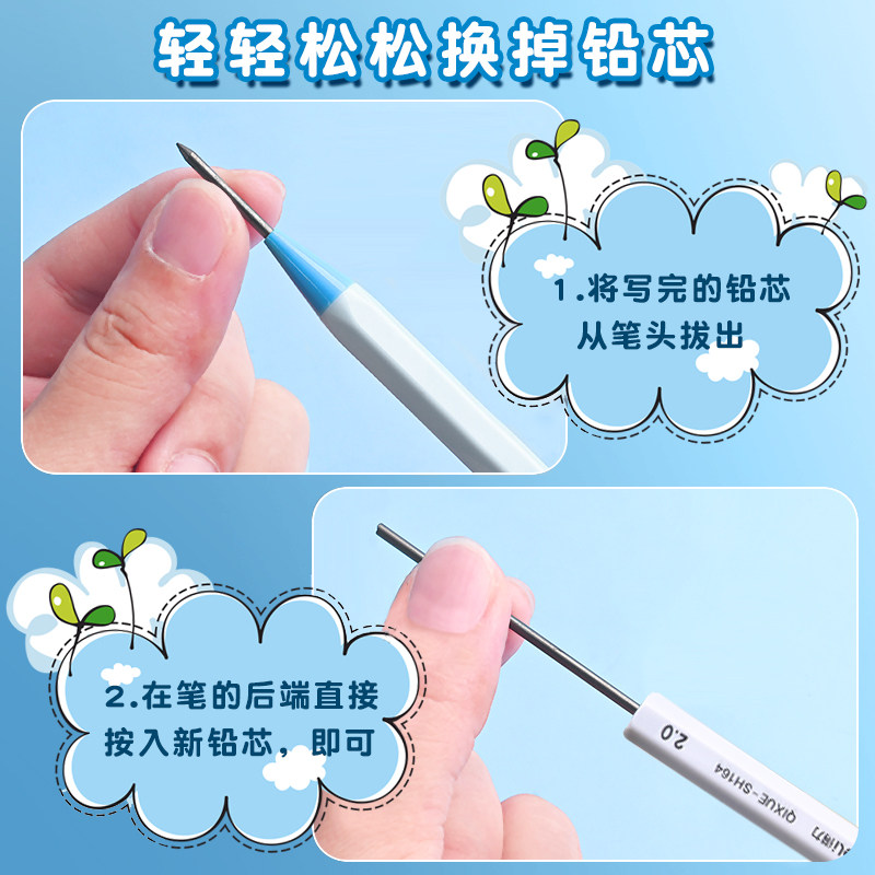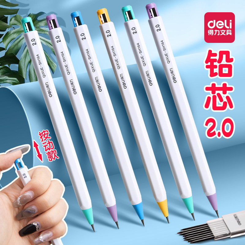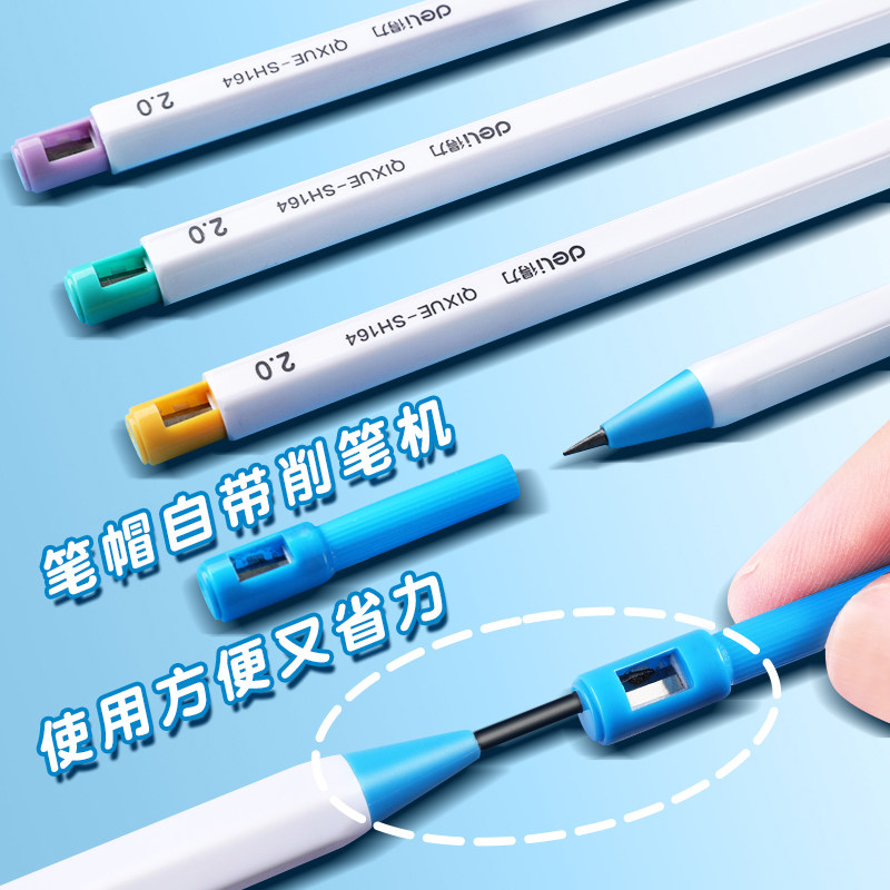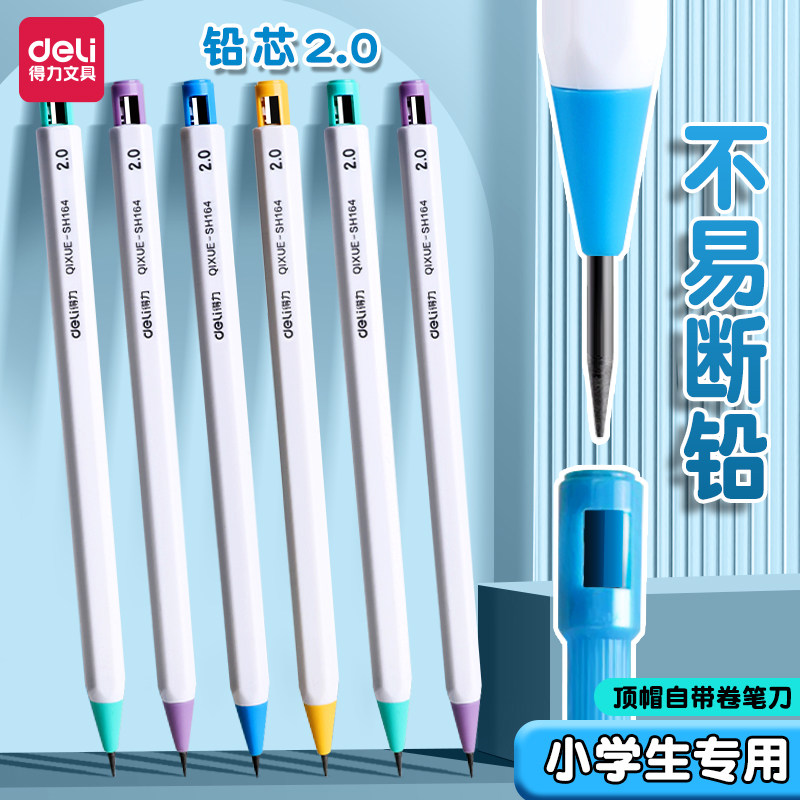 📚 得力自动按动铅笔2.0mm粗心的笔芯粗头hb自带削笔刀可爱2b活动铅笔小学生一二年级儿童六角杆粗芯替芯