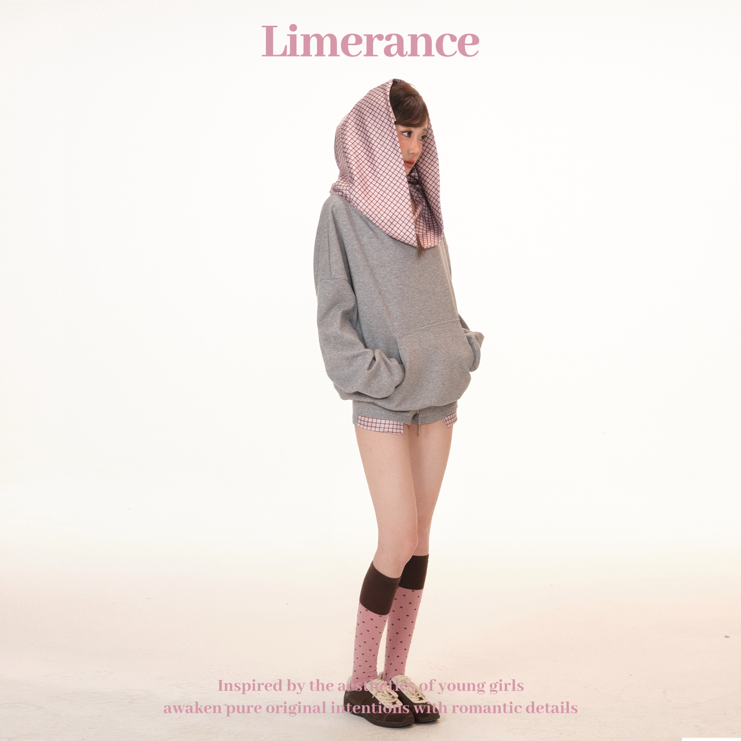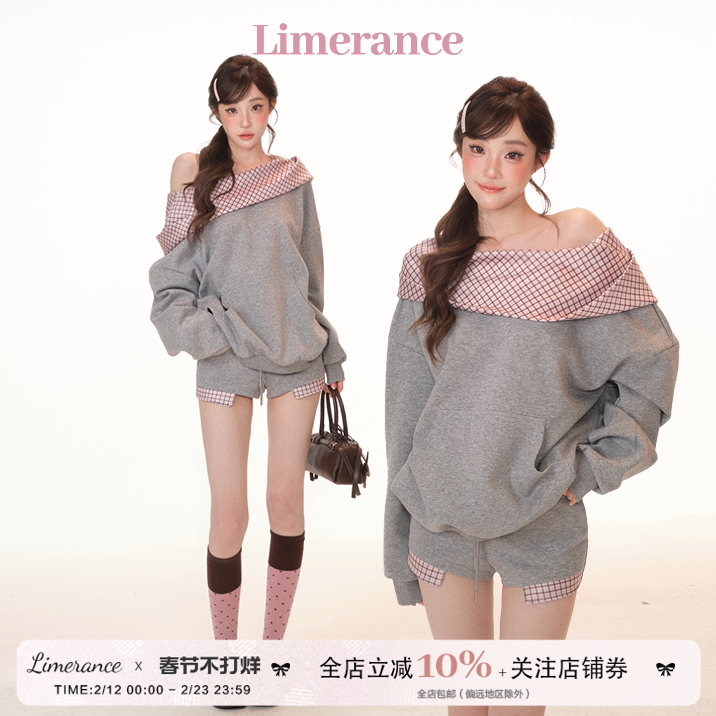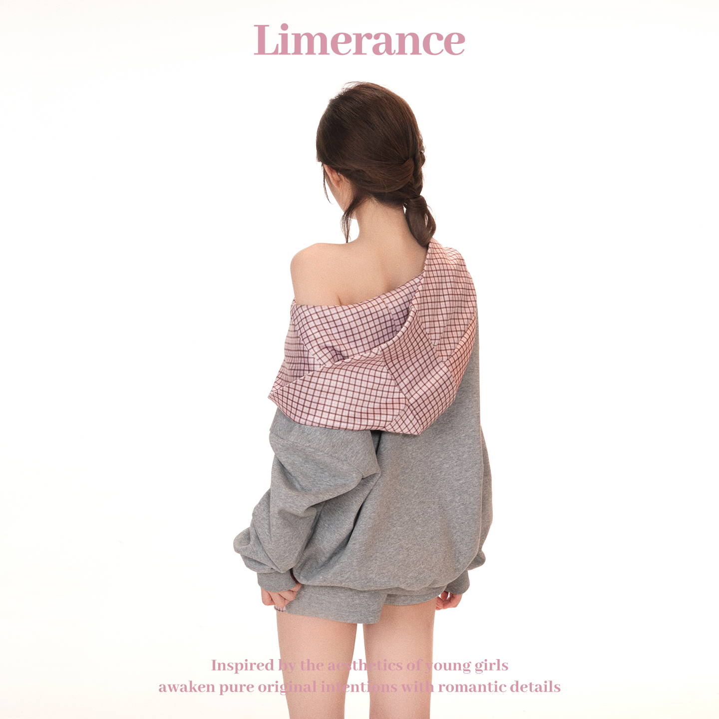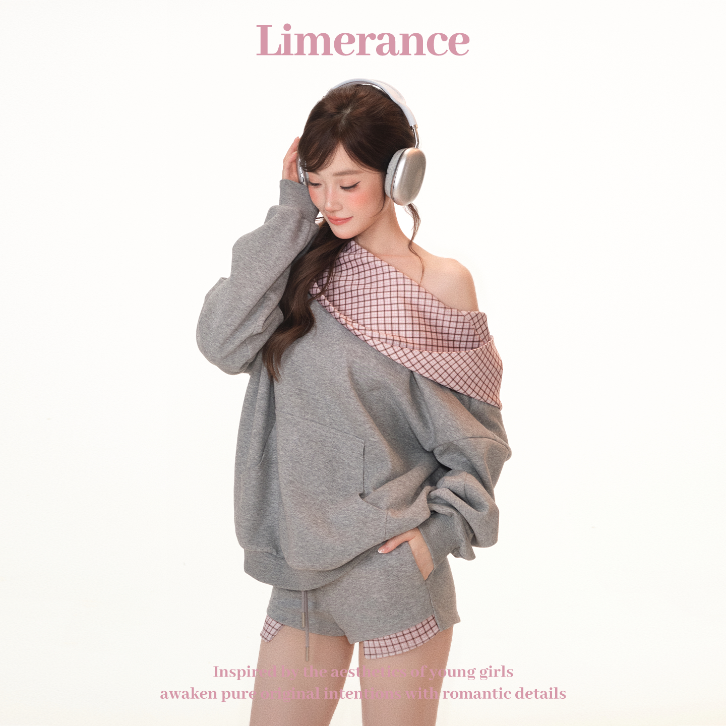 📚 甜梨呆呆 柏林甜茶 冬季套装格子拼接灰色卫衣上衣+短裤两件套女