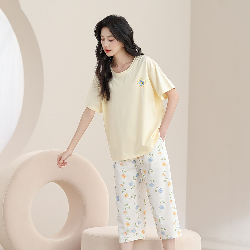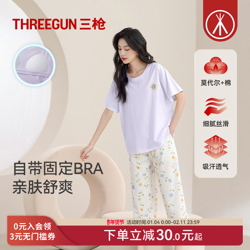 📚 三枪夏季带bra睡衣女短袖短裤甜美莫代尔棉透气凉带胸垫家居服