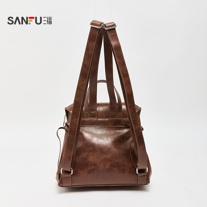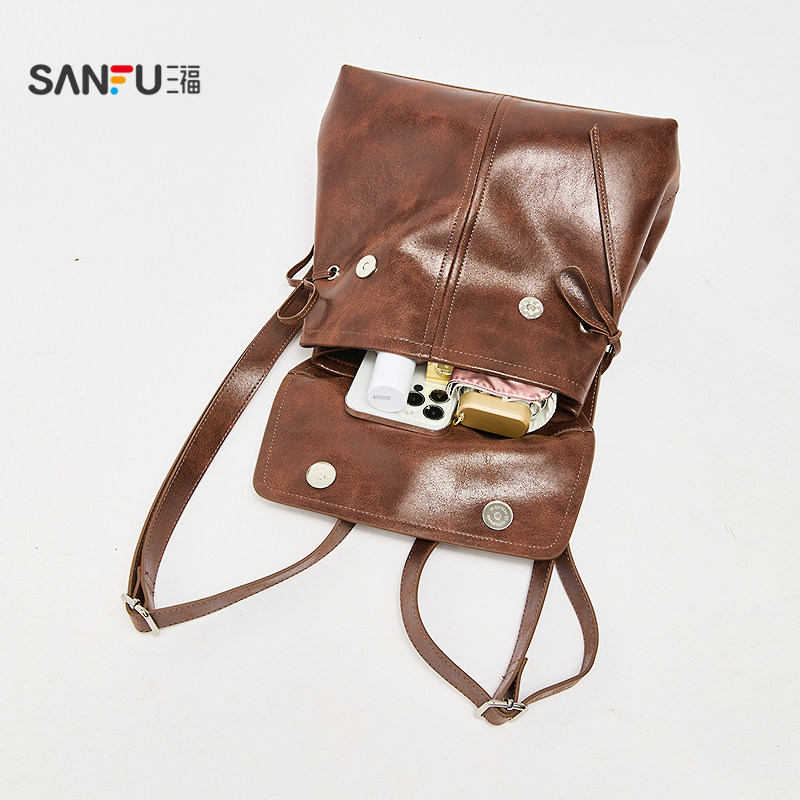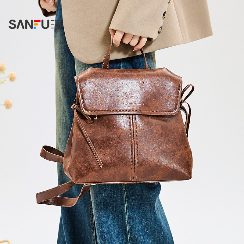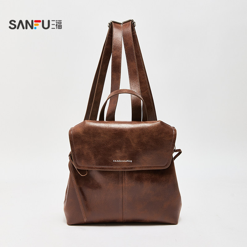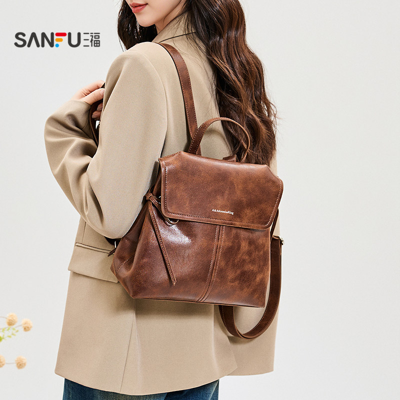 📚 三福背包秋季慵懒慢人复古擦色双肩包翻盖包休闲女包509925