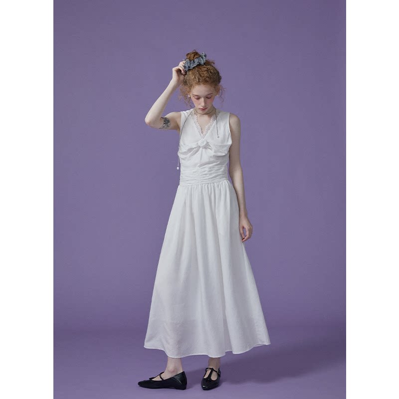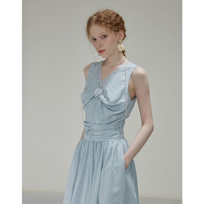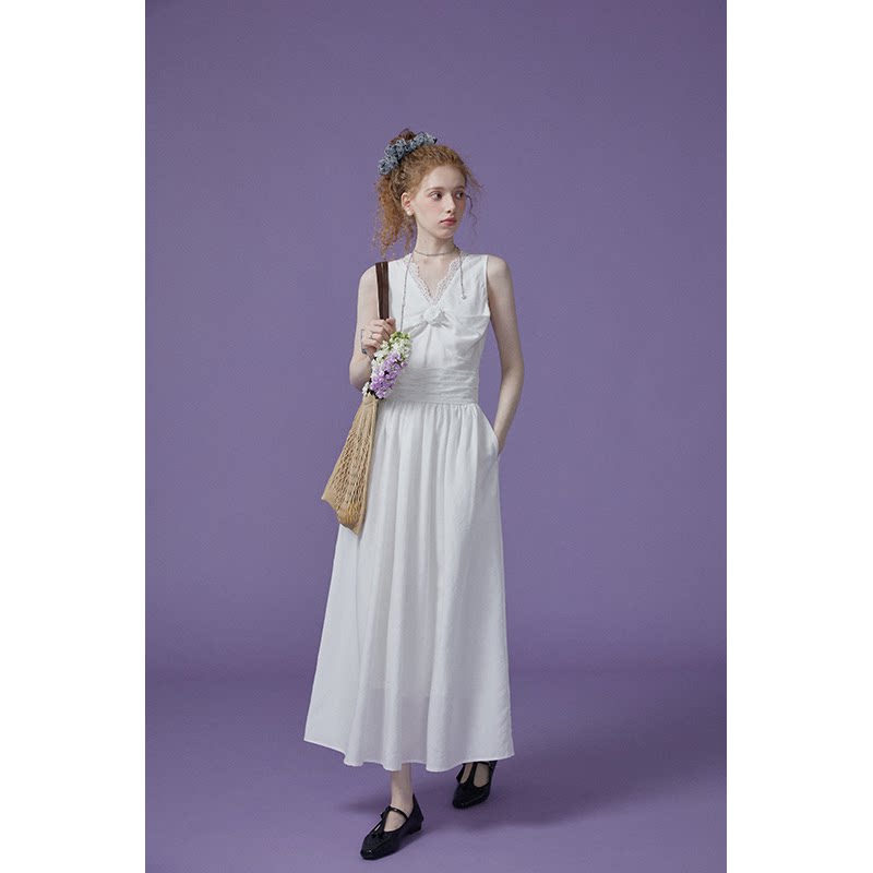 📚 猫酱紫 莱赛尔亚麻玫瑰花连衣裙女蕾丝拼接V领无袖气质法式长裙