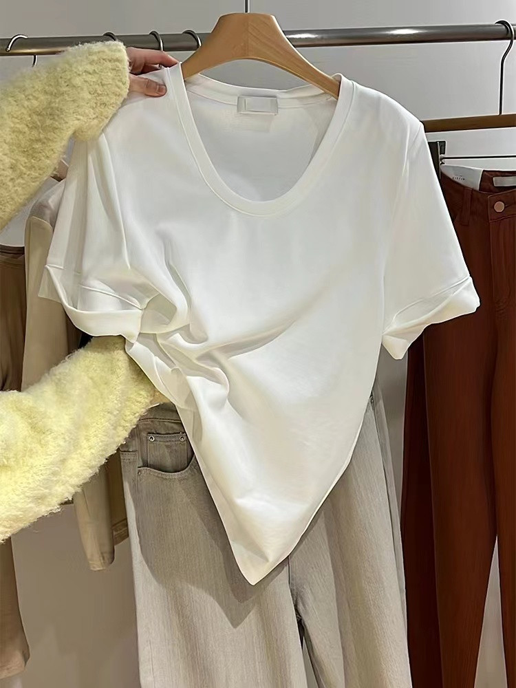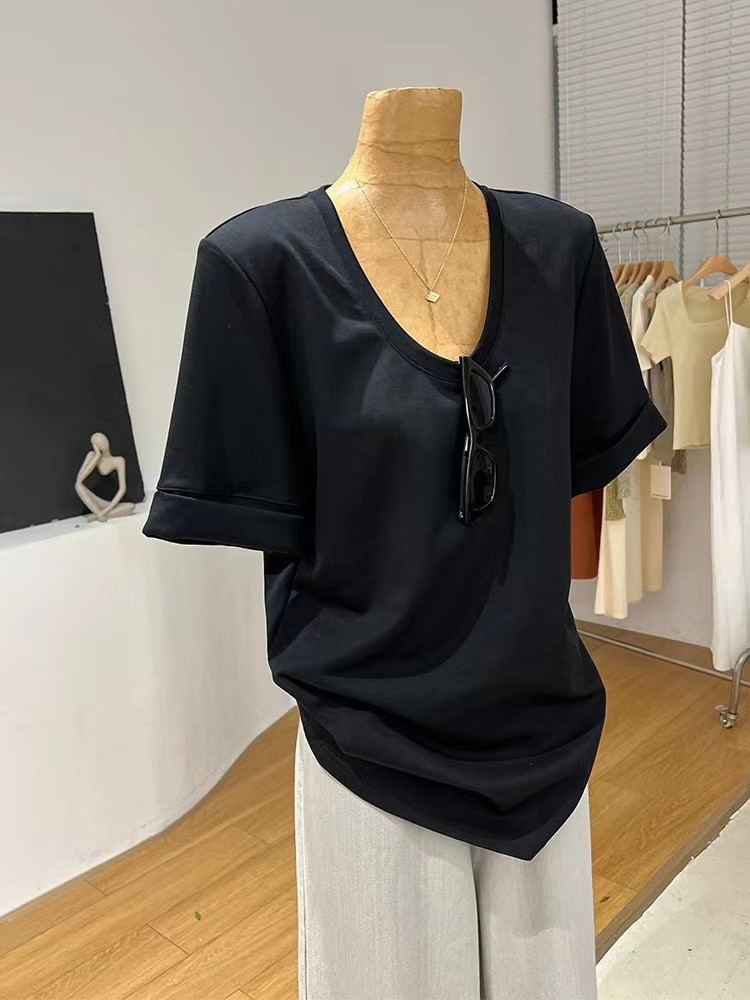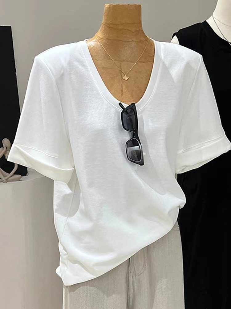 📚 白色大领口u领正肩短袖t恤女夏季新款宽松基础款纯棉垫肩半袖上衣