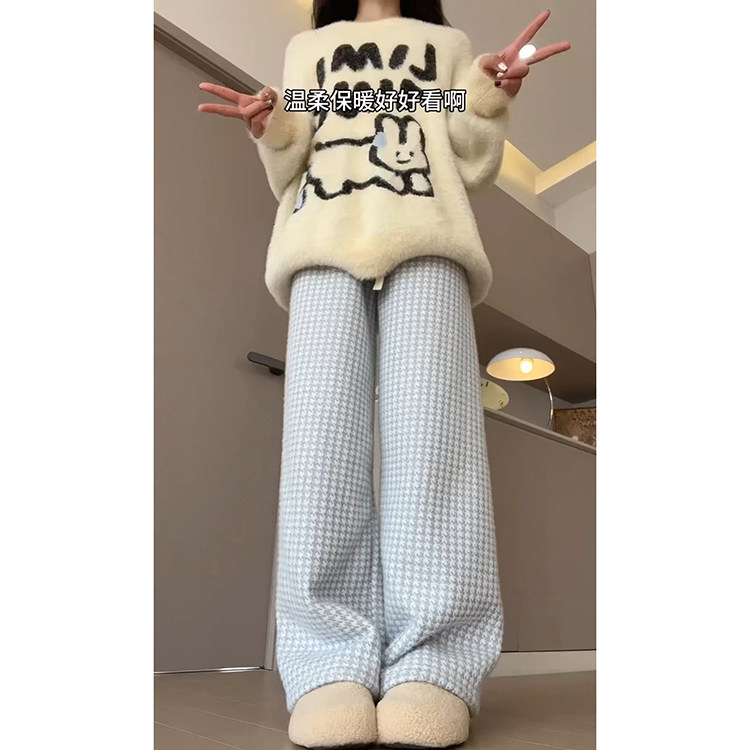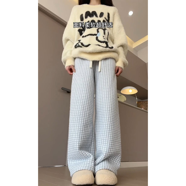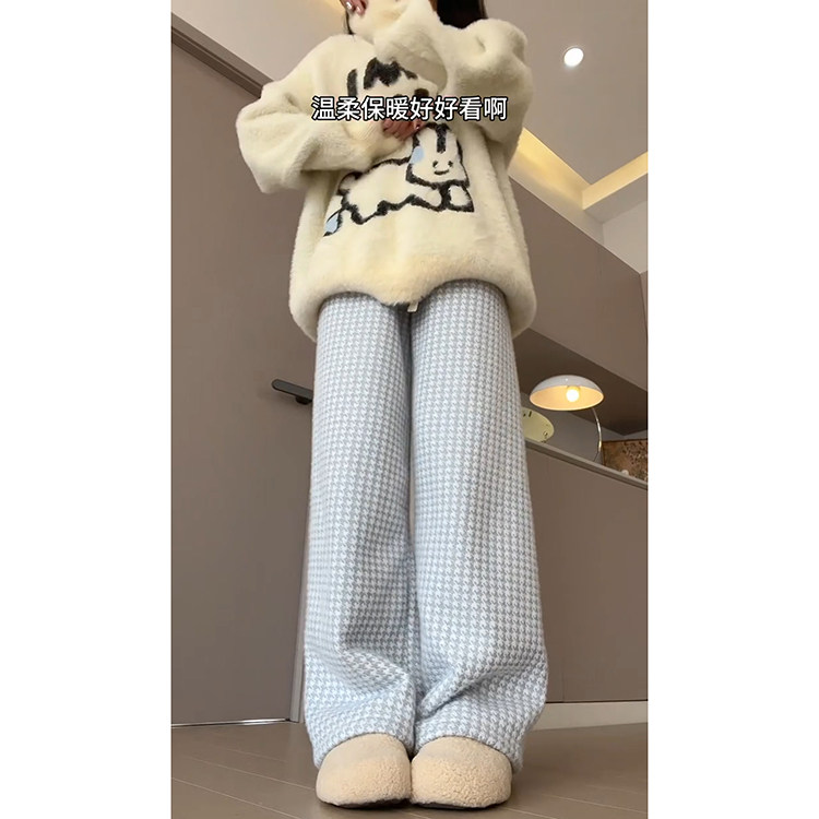 📚 蓝色小香风羊羔绒格子裤女秋冬2024新款小个子加绒加厚保暖休闲裤