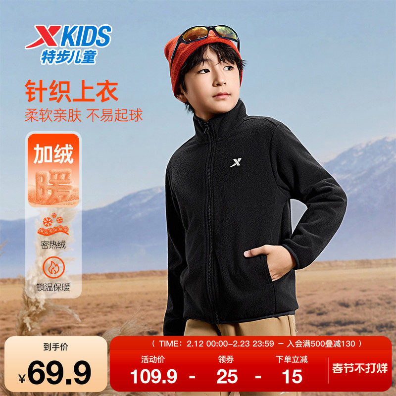 📚 特步童装秋季男童女童运动柔软亲肤加绒保暖外套百搭儿童针织上衣