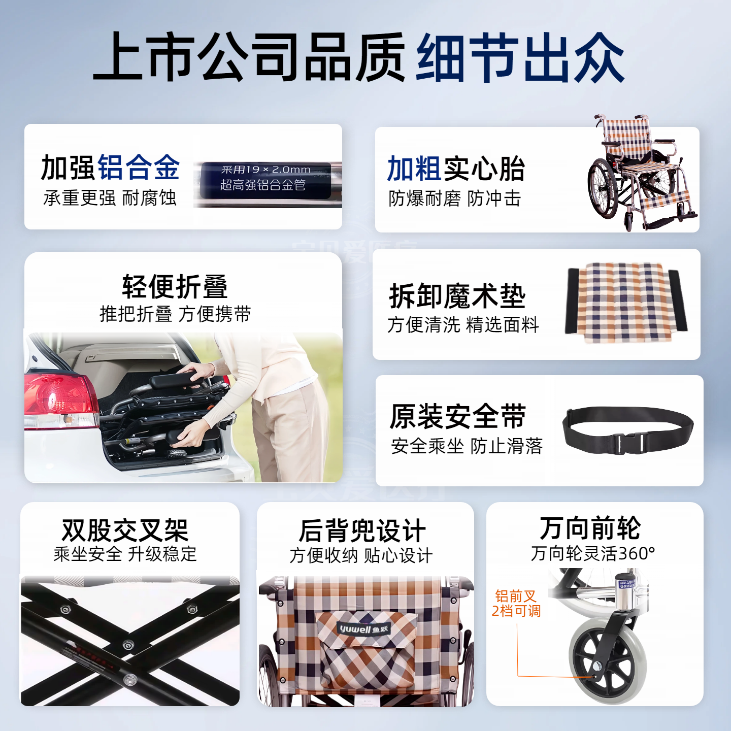 📚 鱼跃轮椅H032C舒适版 铝合金带后刹轻便折叠残疾人大轮手动轮椅车