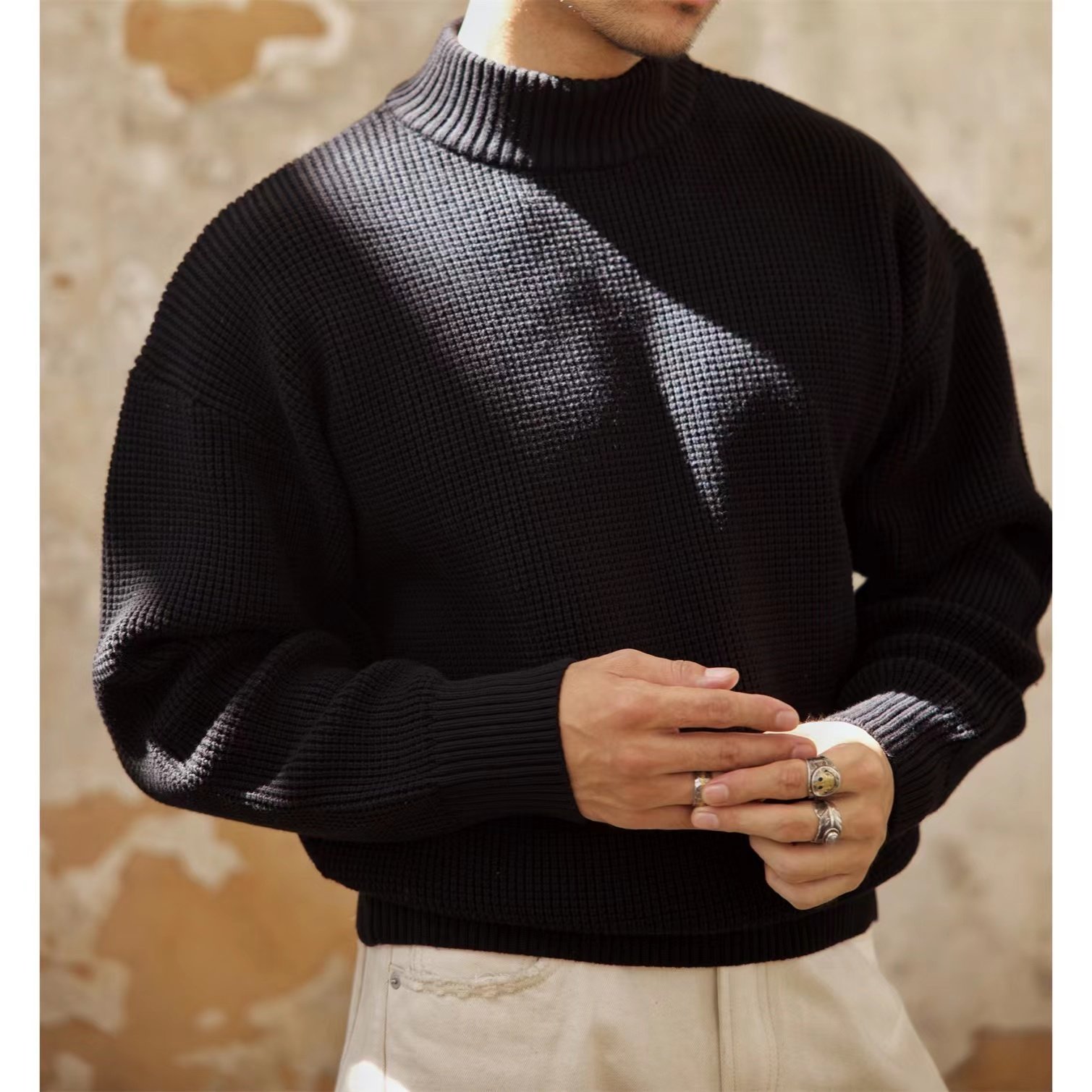 📚 柴米重磅加厚半高领毛衣男纯棉厚实休闲宽松落肩打底美式复古咔叽