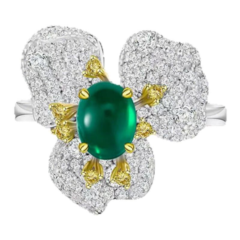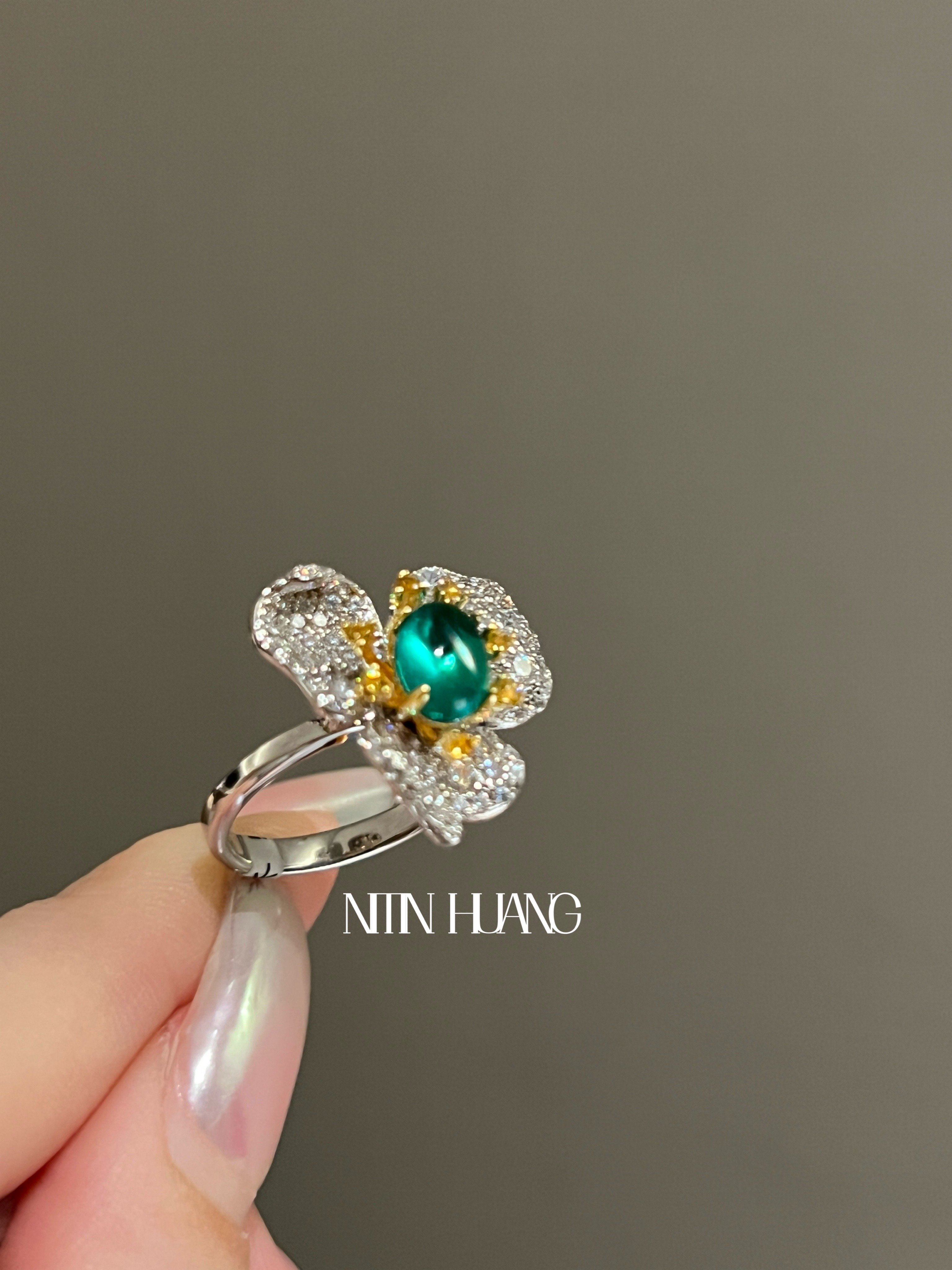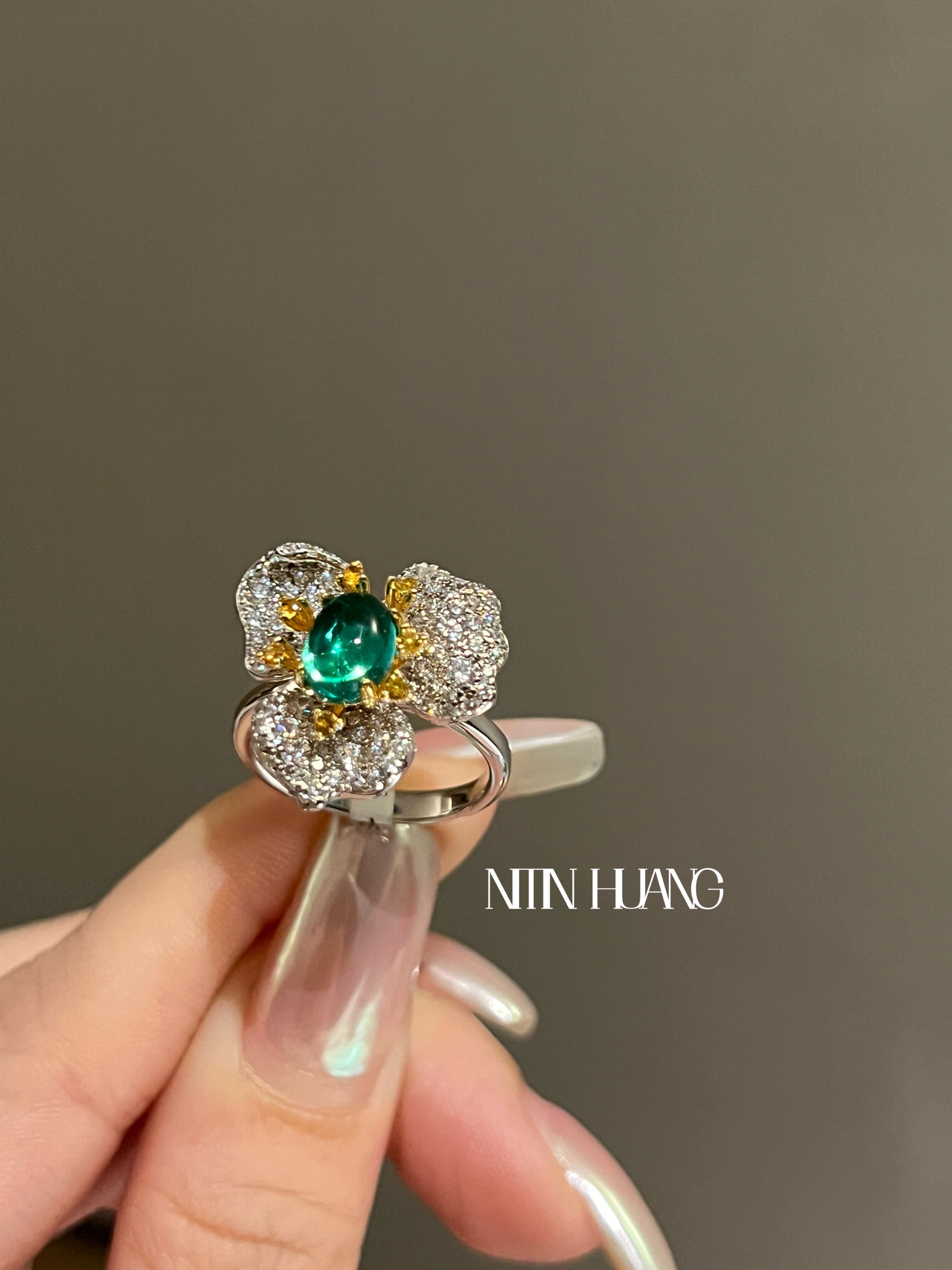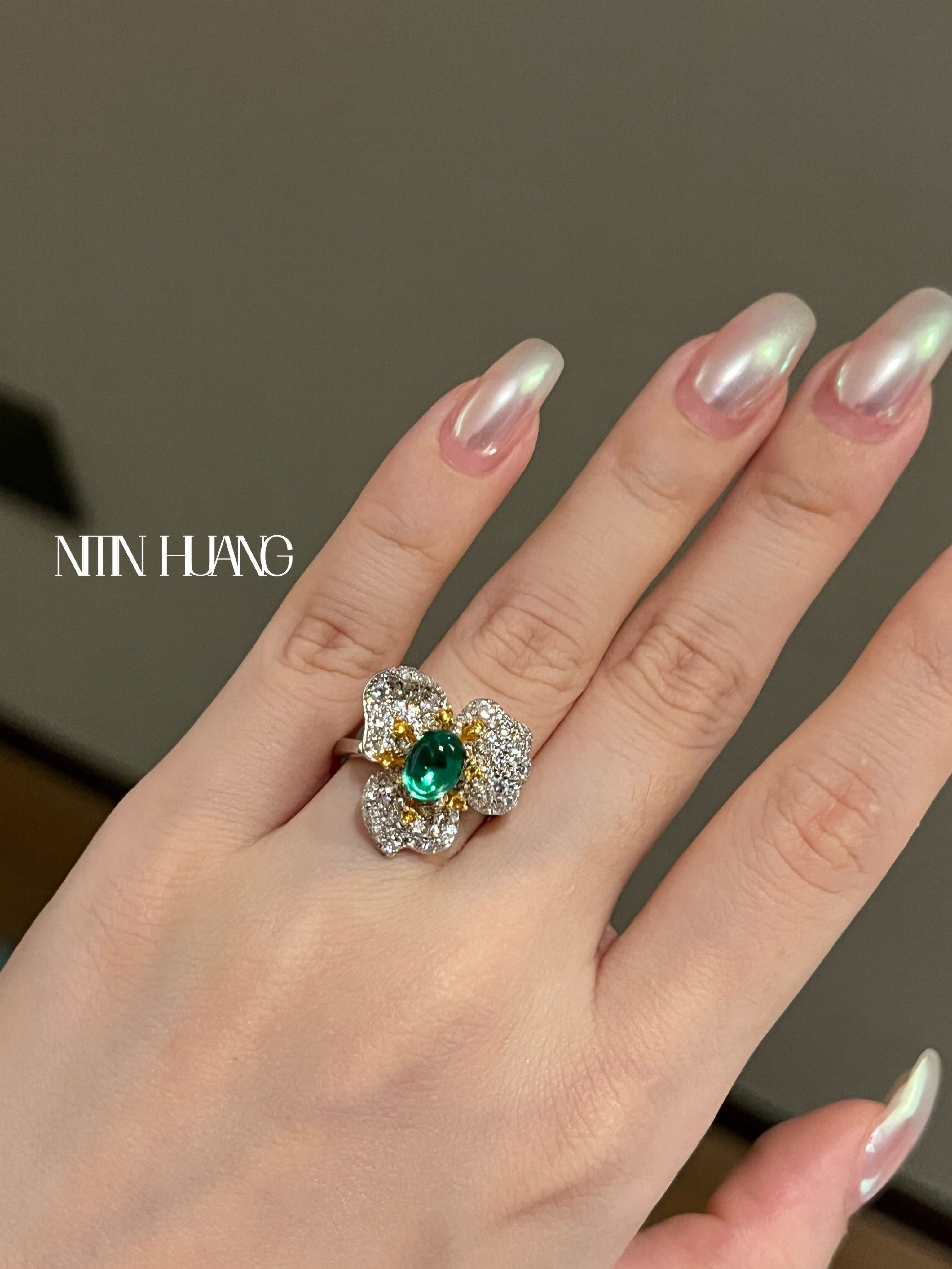 📚 NITIN HUANG 培育祖母绿素面花朵戒指 925纯银镀真金 蛋面2克拉