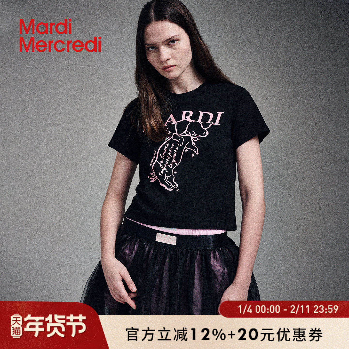 📚 MardiMercredi摇尾珍珠小狗短袖t恤上衣腊肠狗线条正肩修身小个子