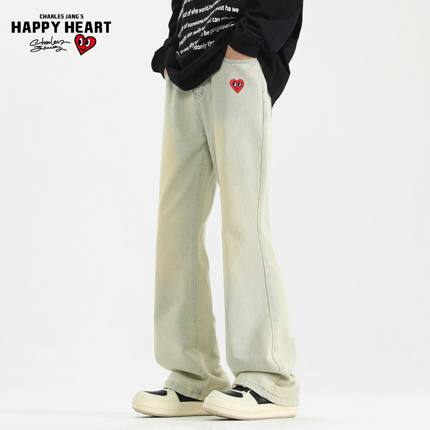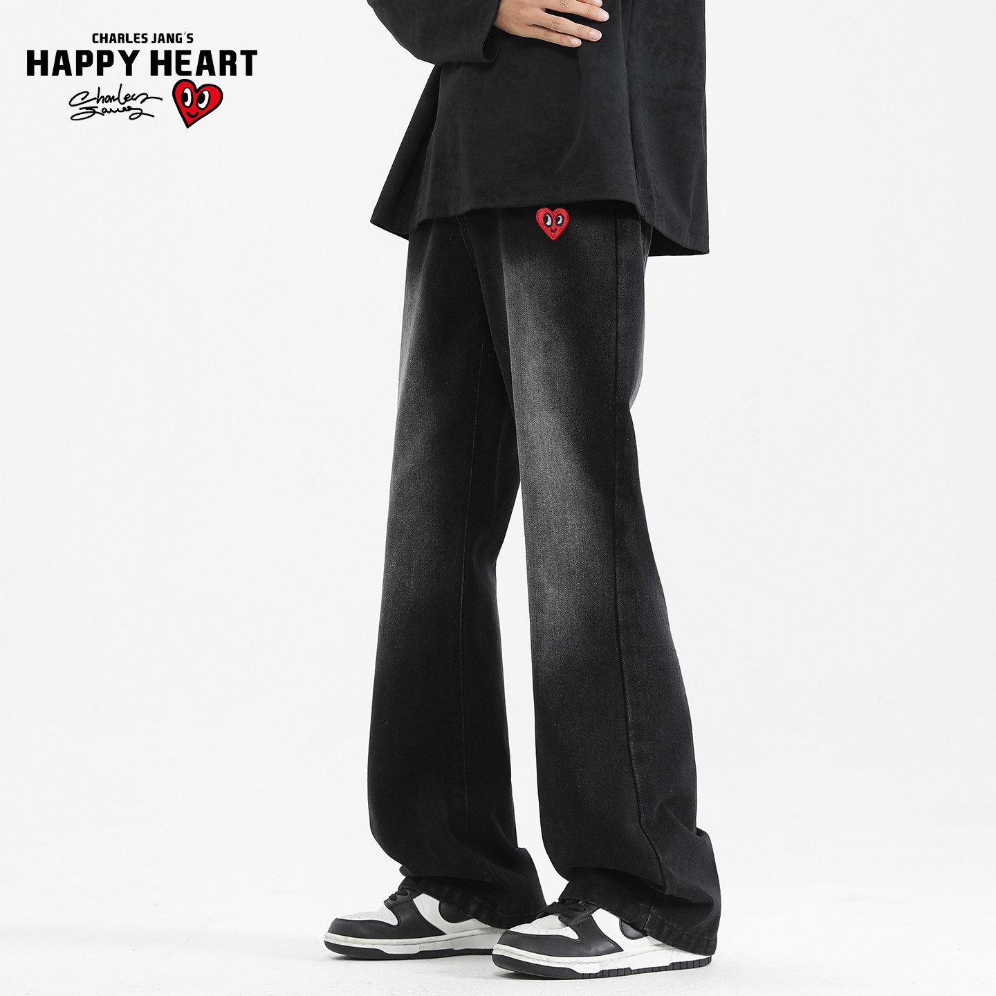 📚 查尔斯桃心美式复古牛仔裤男秋冬季爱心刺绣磨白水洗阔腿长裤子