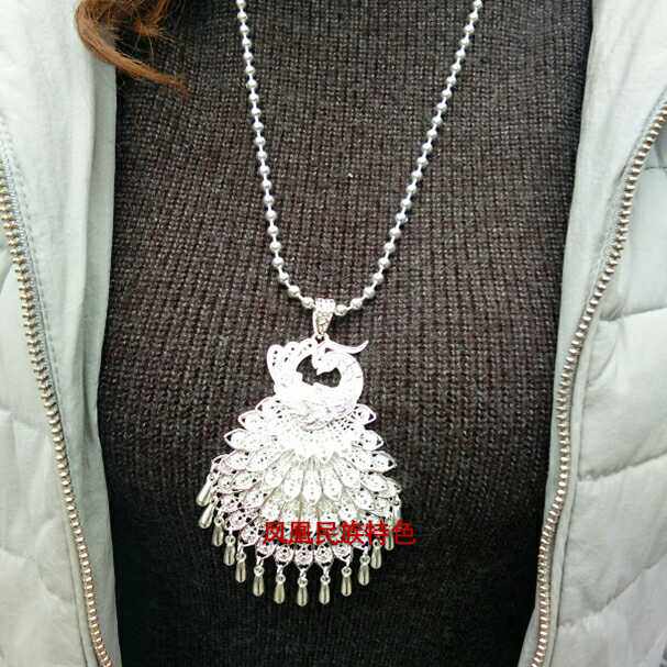 📚 新款民族风凤凰回头吊坠长款圆珠佛珠毛衣链 纯手工凤凰银色项链
