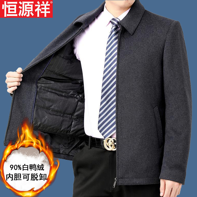 📚 恒源祥冬季羊绒大衣男短款加厚中老年休闲羽绒内胆翻领羊毛呢外套