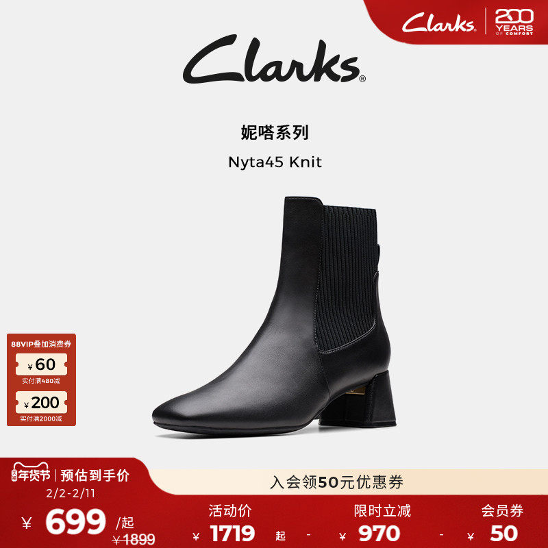 📚 Clarks其乐Nyta45Knit秋冬女鞋新品瘦瘦靴羊皮短靴黑色中筒袜靴女