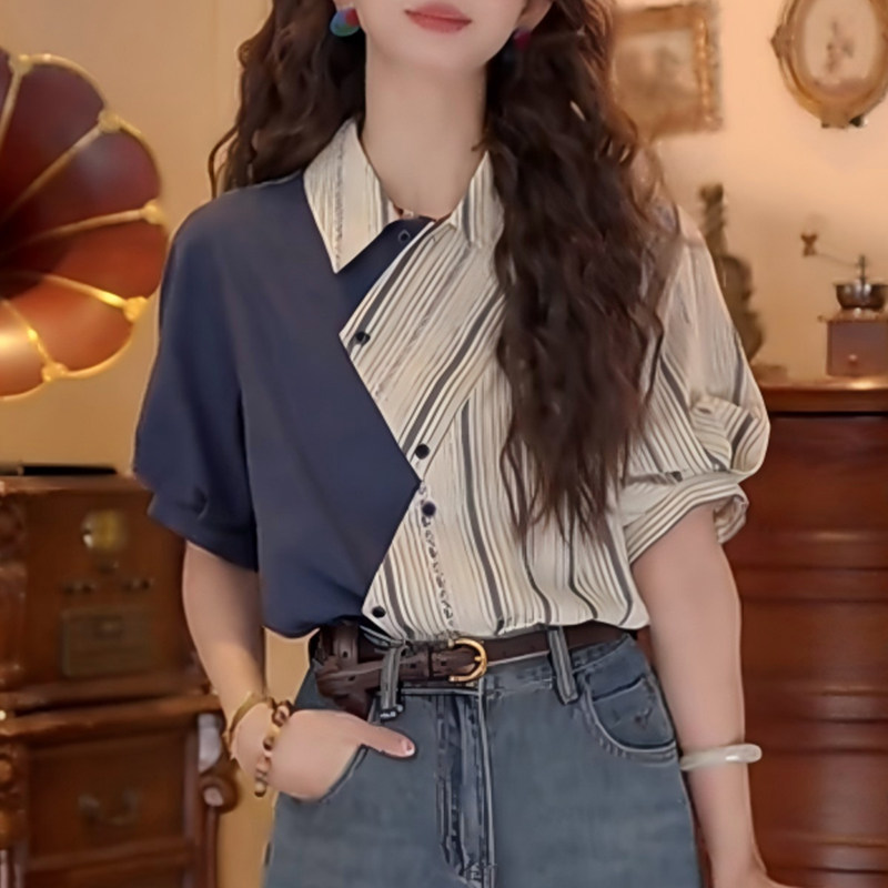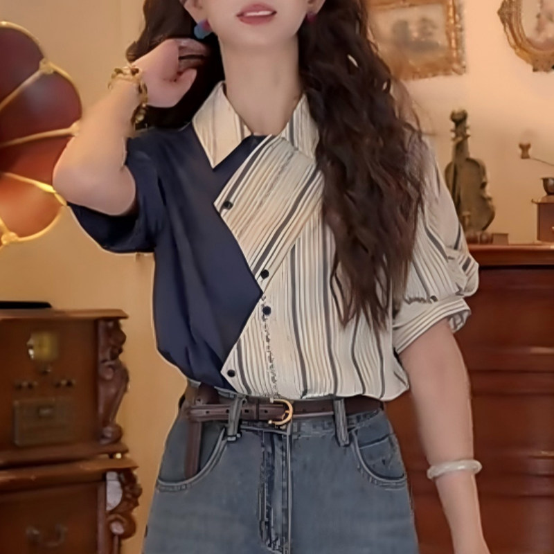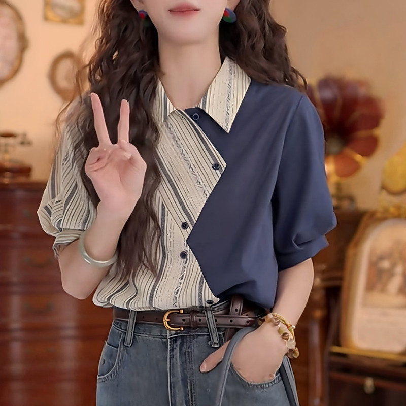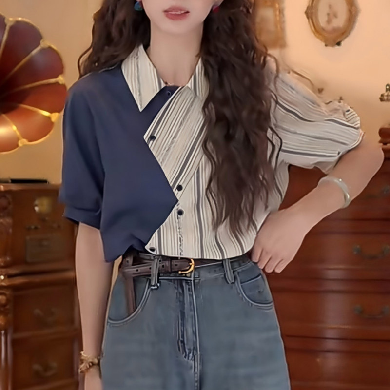 📚 设计感不规则拼接条纹翻领短袖衬衫女夏季2026新款复古港风上衣潮