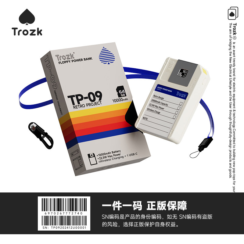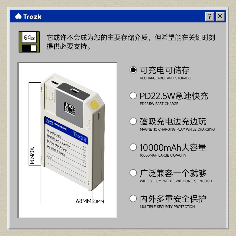 📚 特洛克软盘磁吸无线充电宝带U盘快充大容量10000毫安移动电源便携