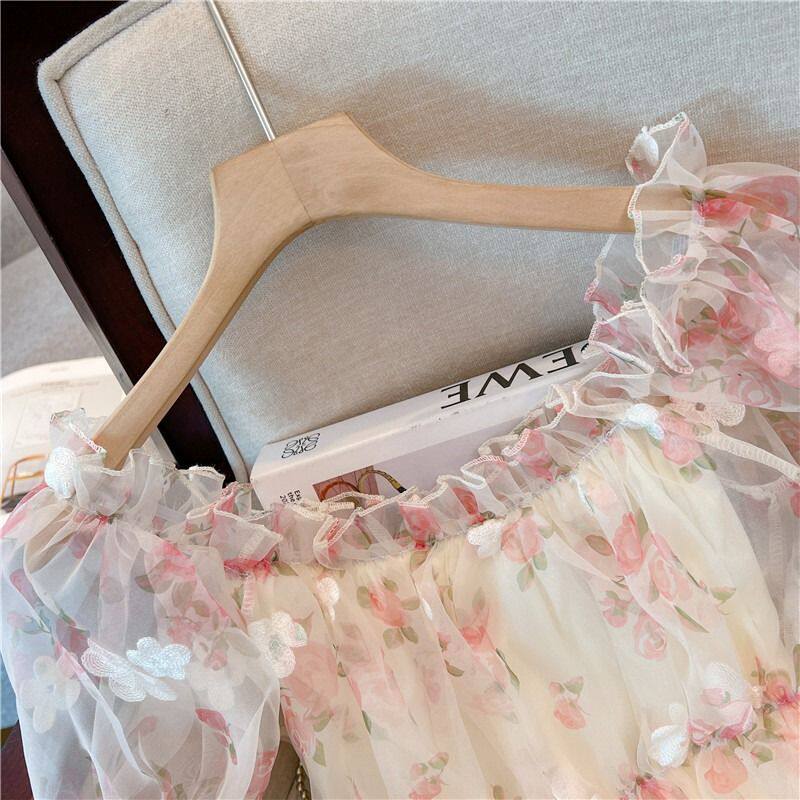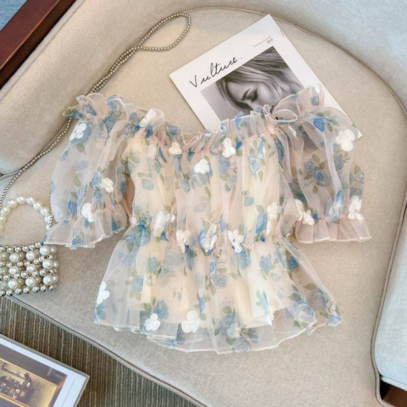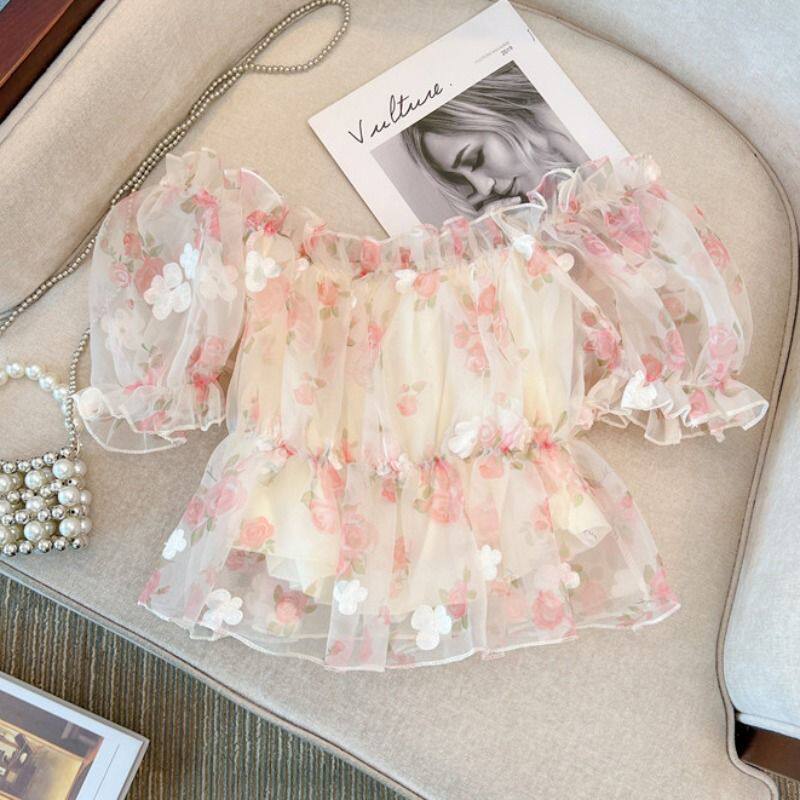 📚 小清新甜美碎花雪纺衫女装夏季新款法式泡泡袖小衫一字肩短款上衣