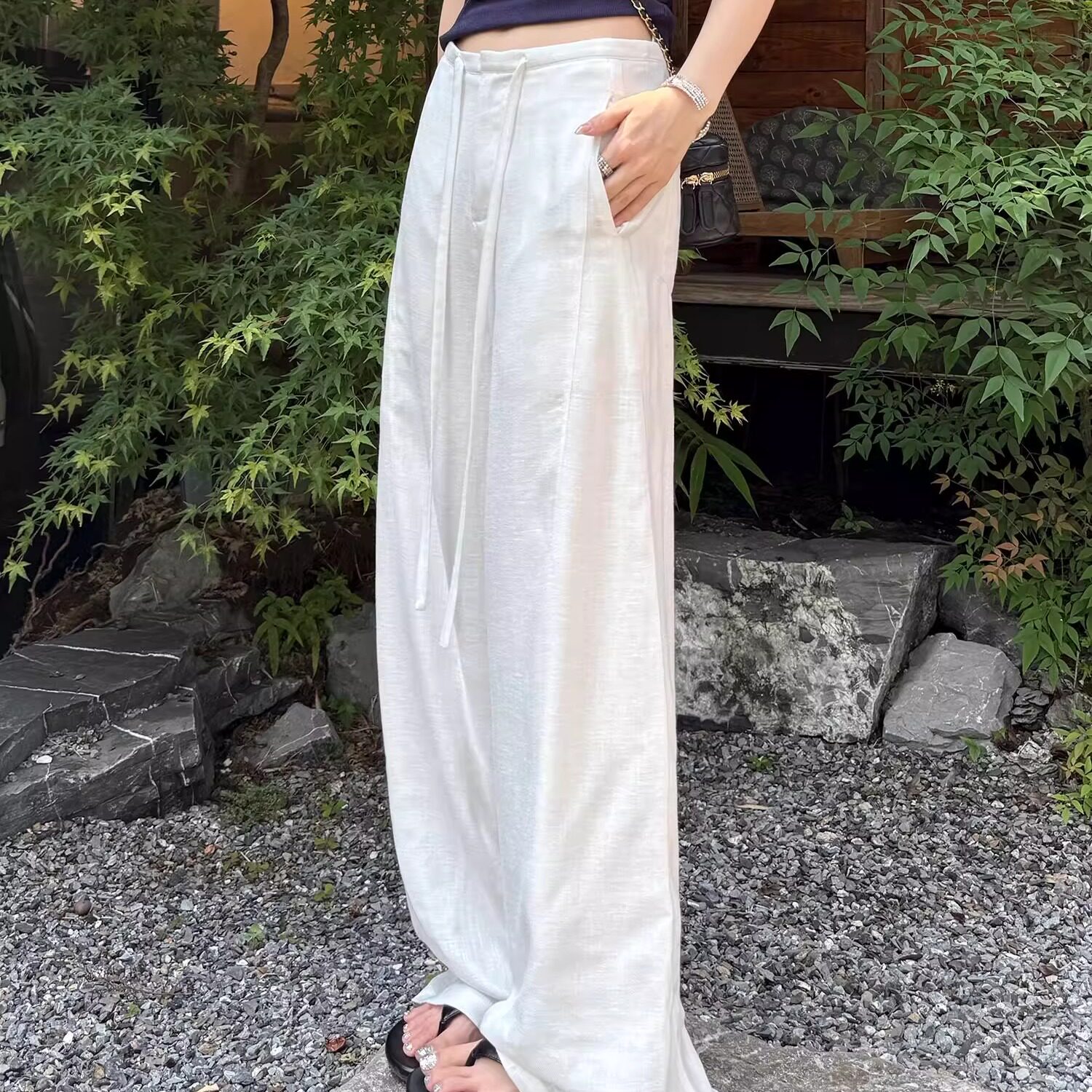 📚 老钱风慵懒感白色亚麻阔腿裤女高腰直筒夏季新款百搭棉麻休闲长裤