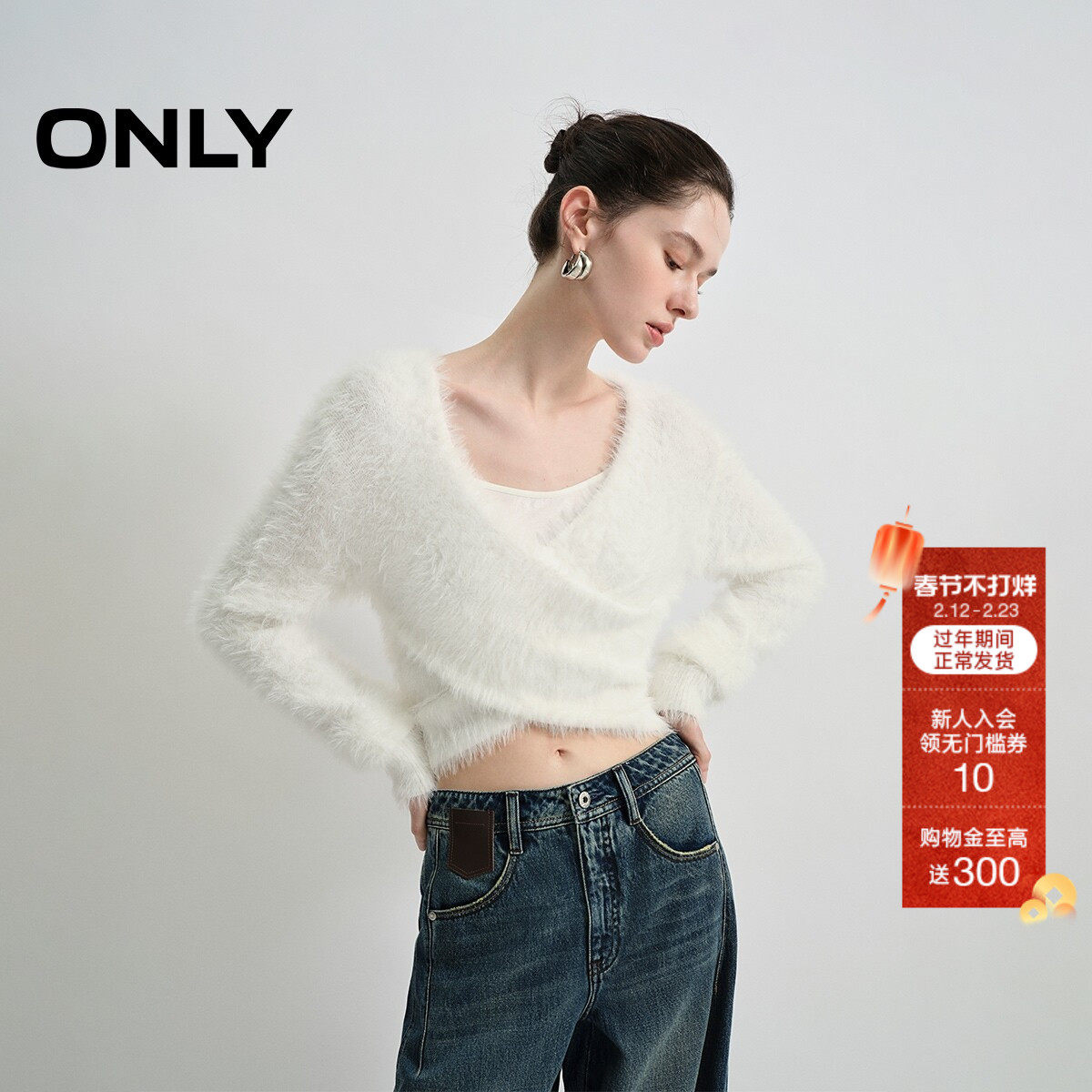 📚 ONLY2025冬季新款优雅叠拼深V领口纯色亲肤软糯毛感短款针织衫女