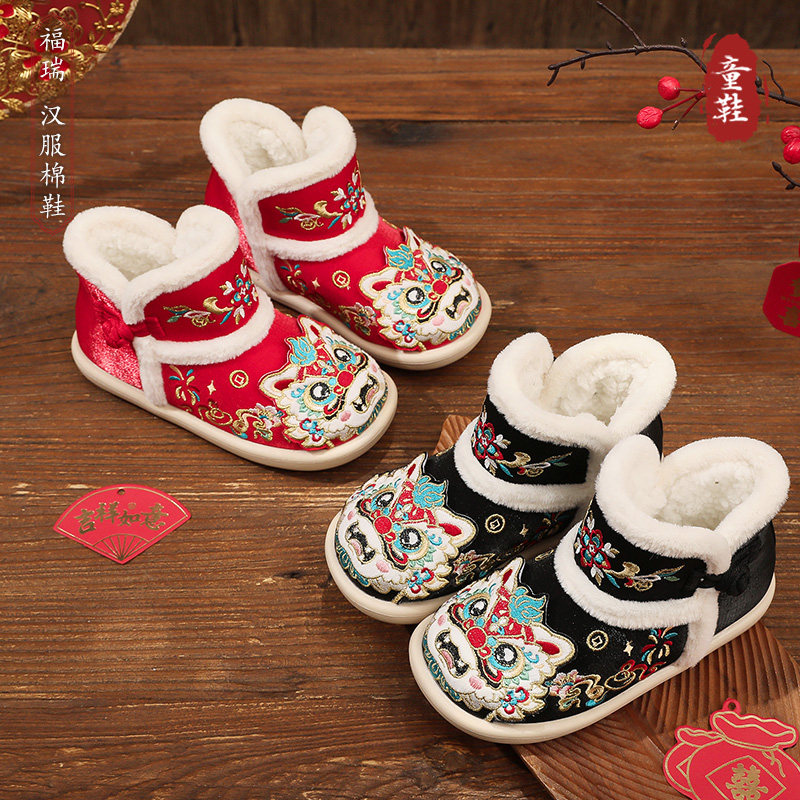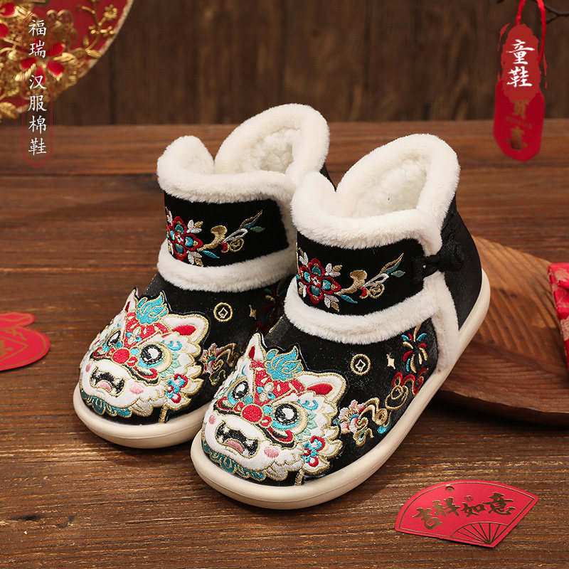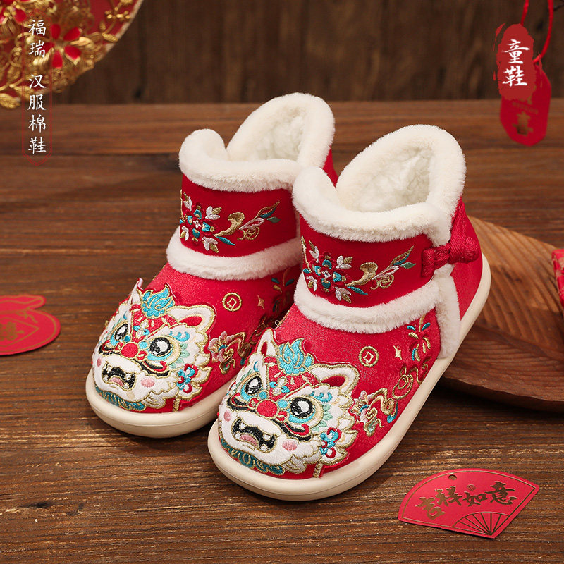 📚 汉服鞋儿童大棉鞋冬季加绒绣花短靴古风古装民族风新年拜年虎头鞋