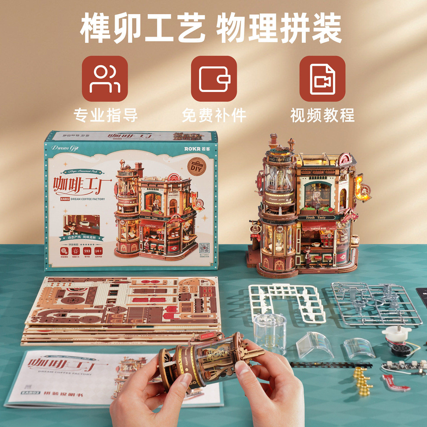 📚 ROKR若客咖啡工厂diy手工拼装积木模型玩具立体拼图儿童节礼物女
