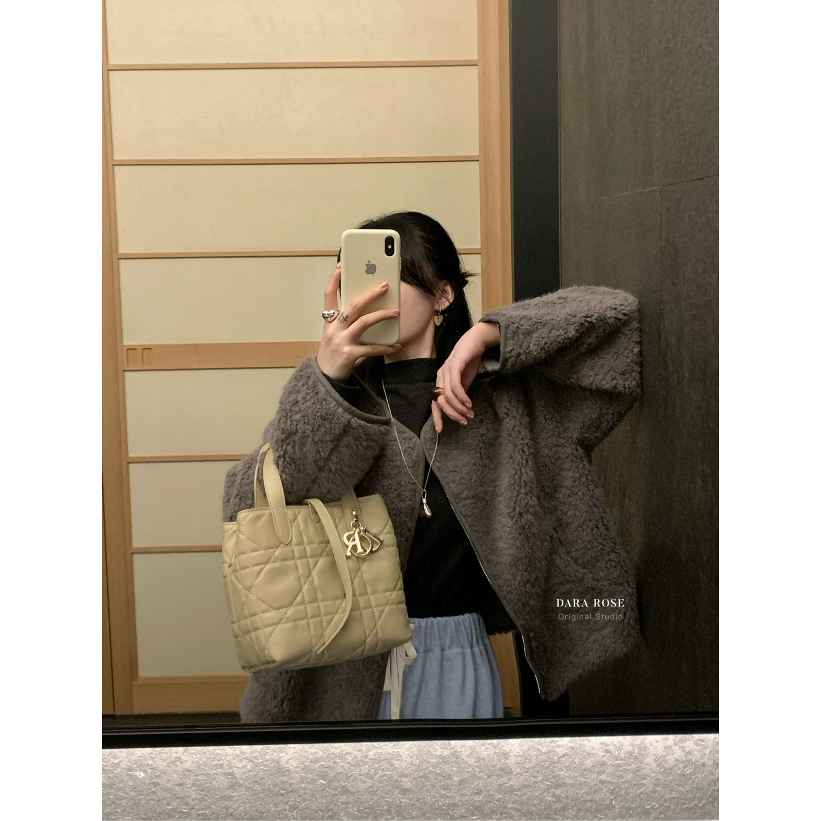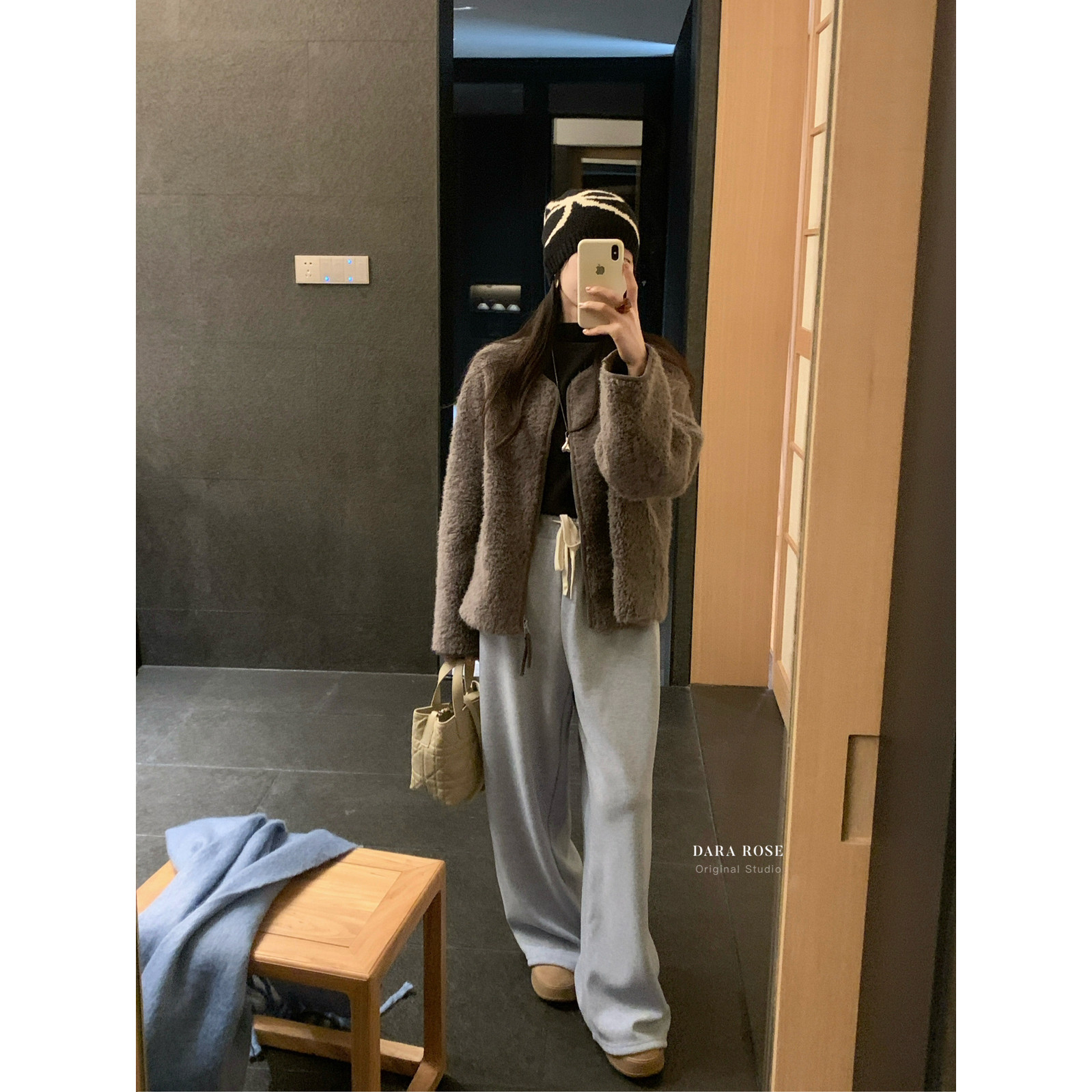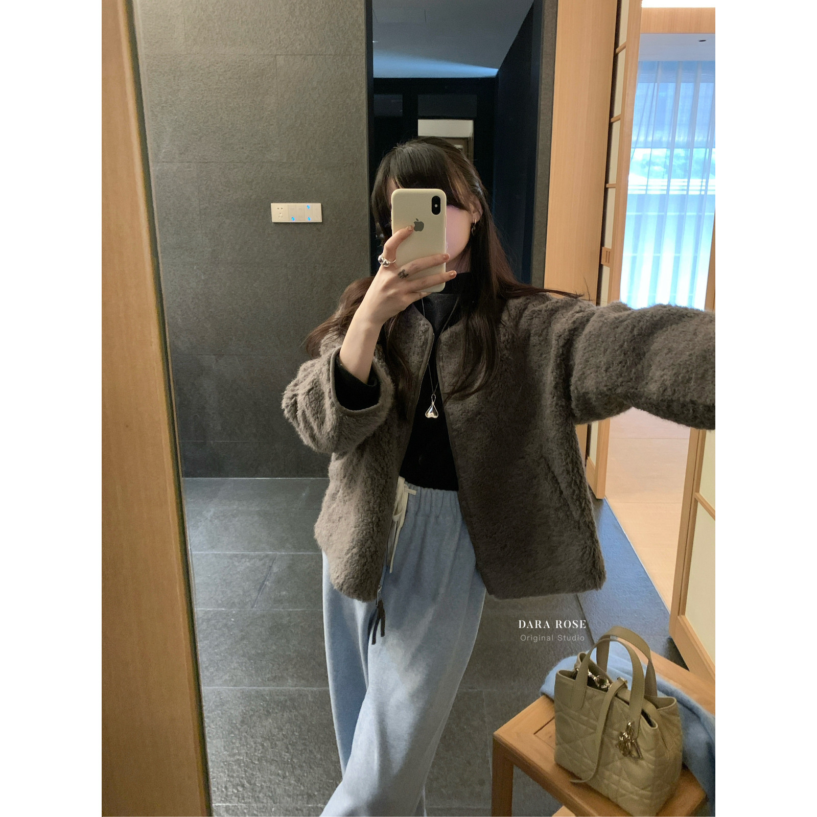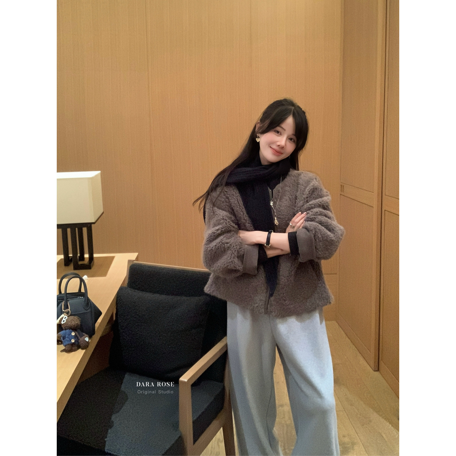 📚 DARA ROSE-羊羔毛时髦高级灰保暖圆领拉链毛毛短外套(配针织围巾)