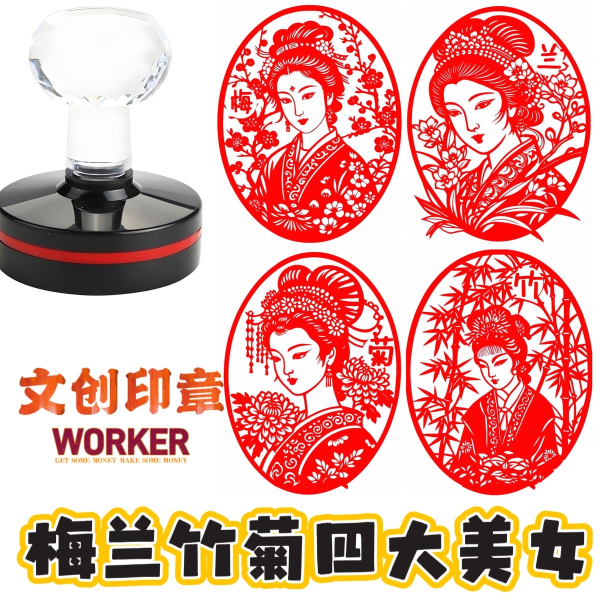 📚 一套4个/梅兰竹菊四大美女印章文化创意类卡通动漫印礼品打卡盖章