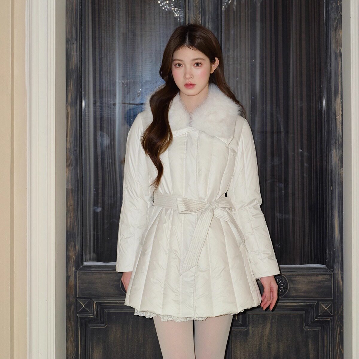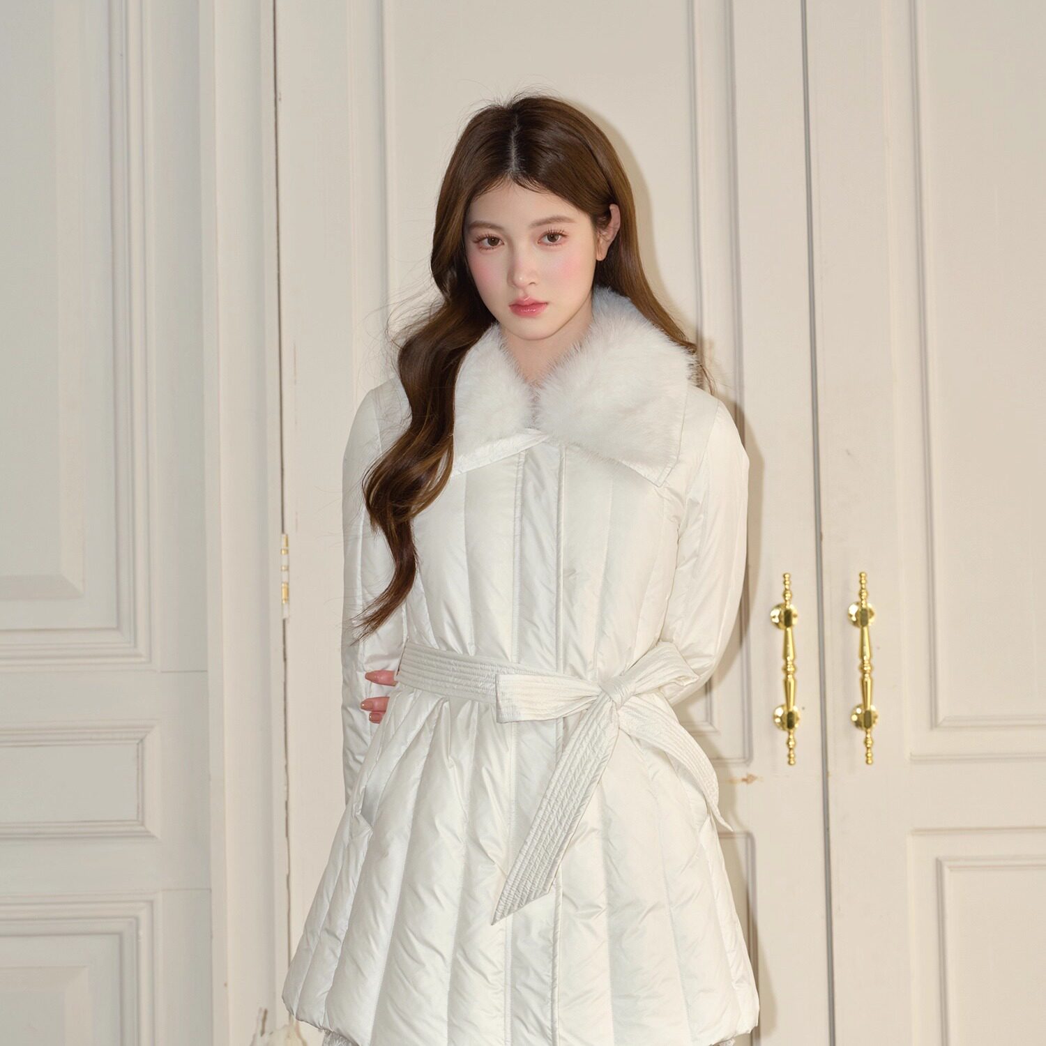 📚 RECIT 白色拼接毛领收腰系带90国标白鸭绒少女中长款排骨羽绒服