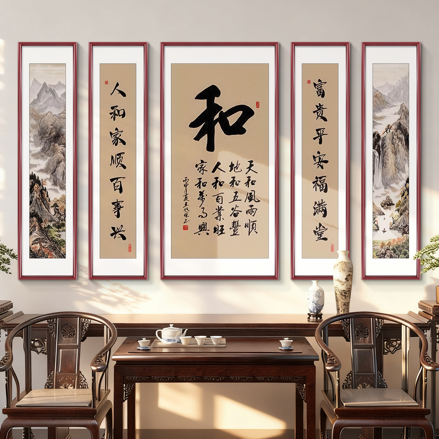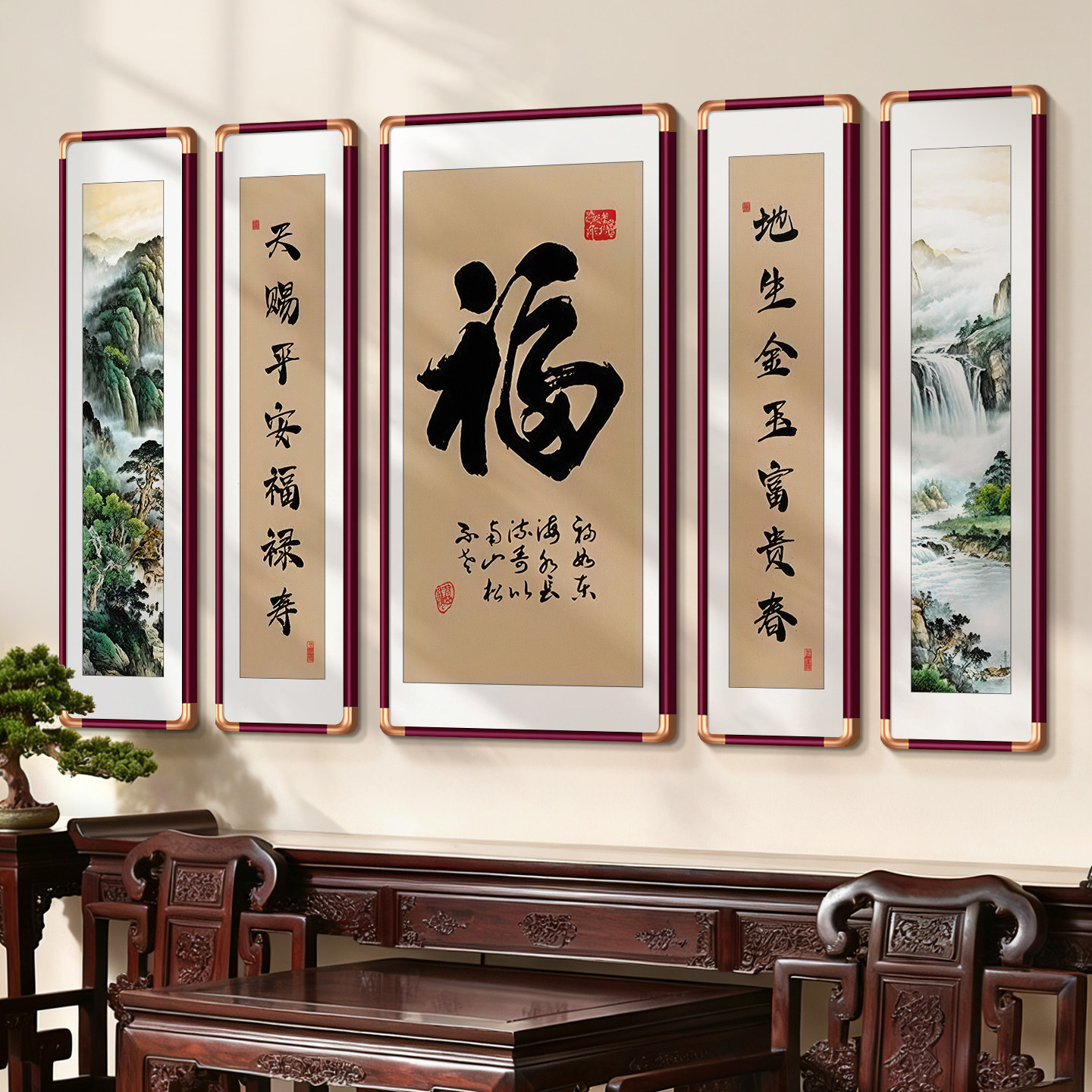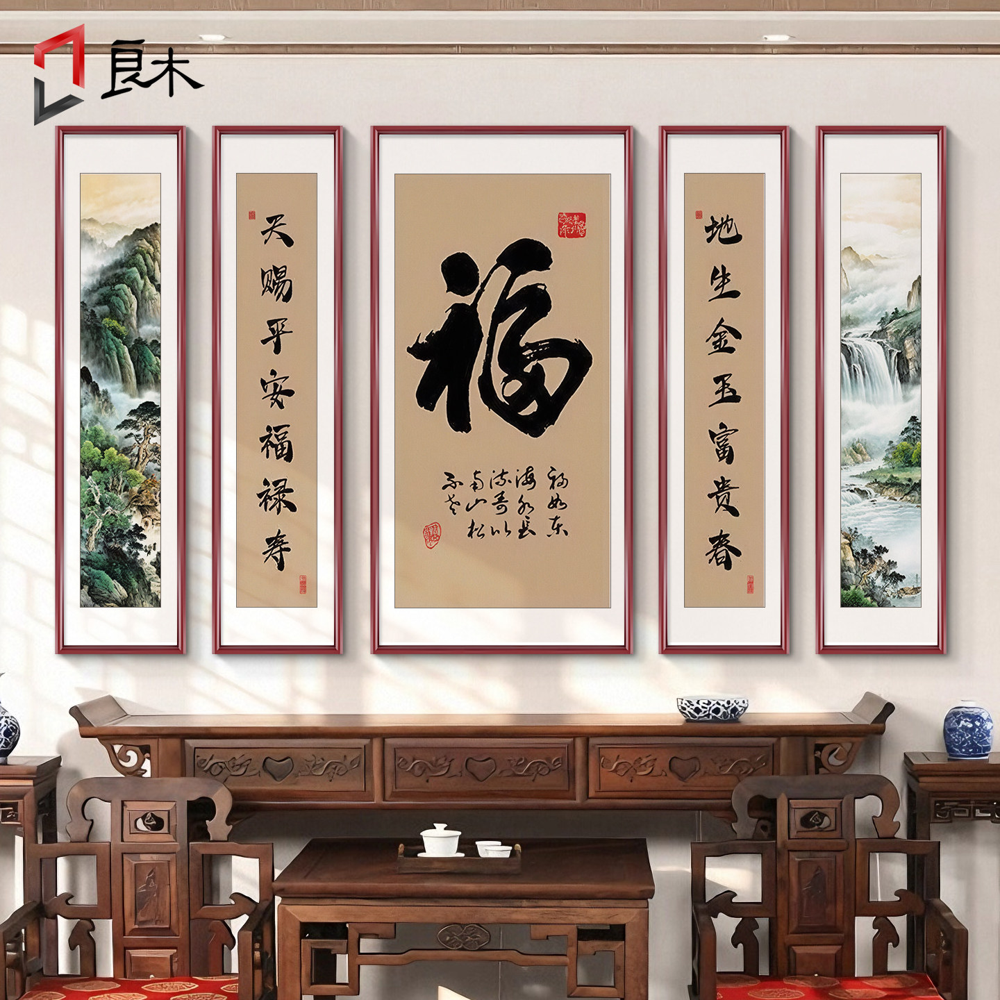📚 福字书法农村迎门墙壁画中堂画客厅挂画五联堂屋大气背景墙装饰画