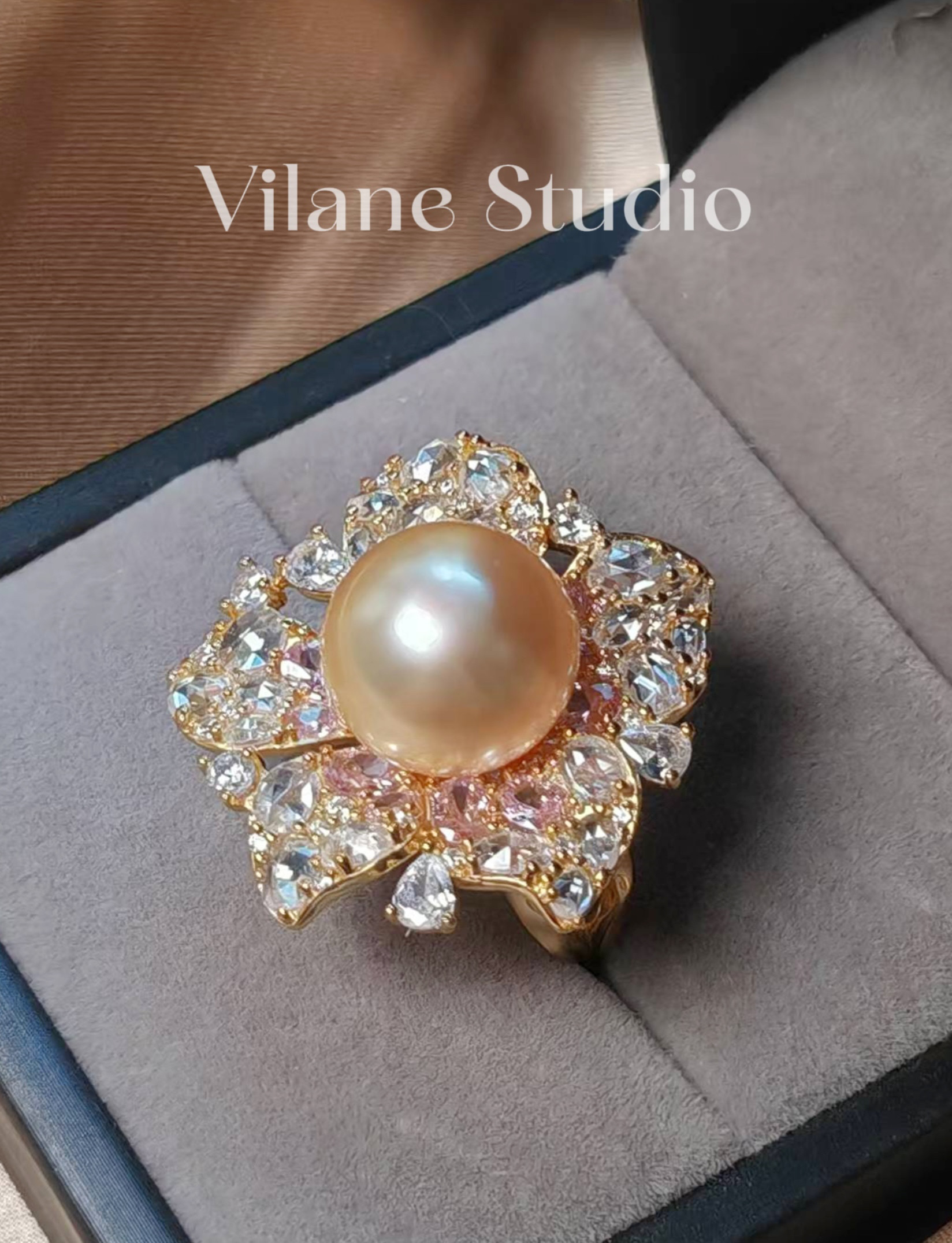 📚 海水金珠中金色12.9大点位干净镜面光纯银镀18k金开口戒指