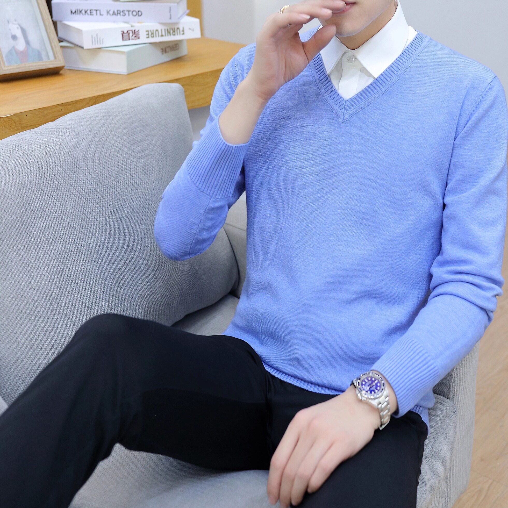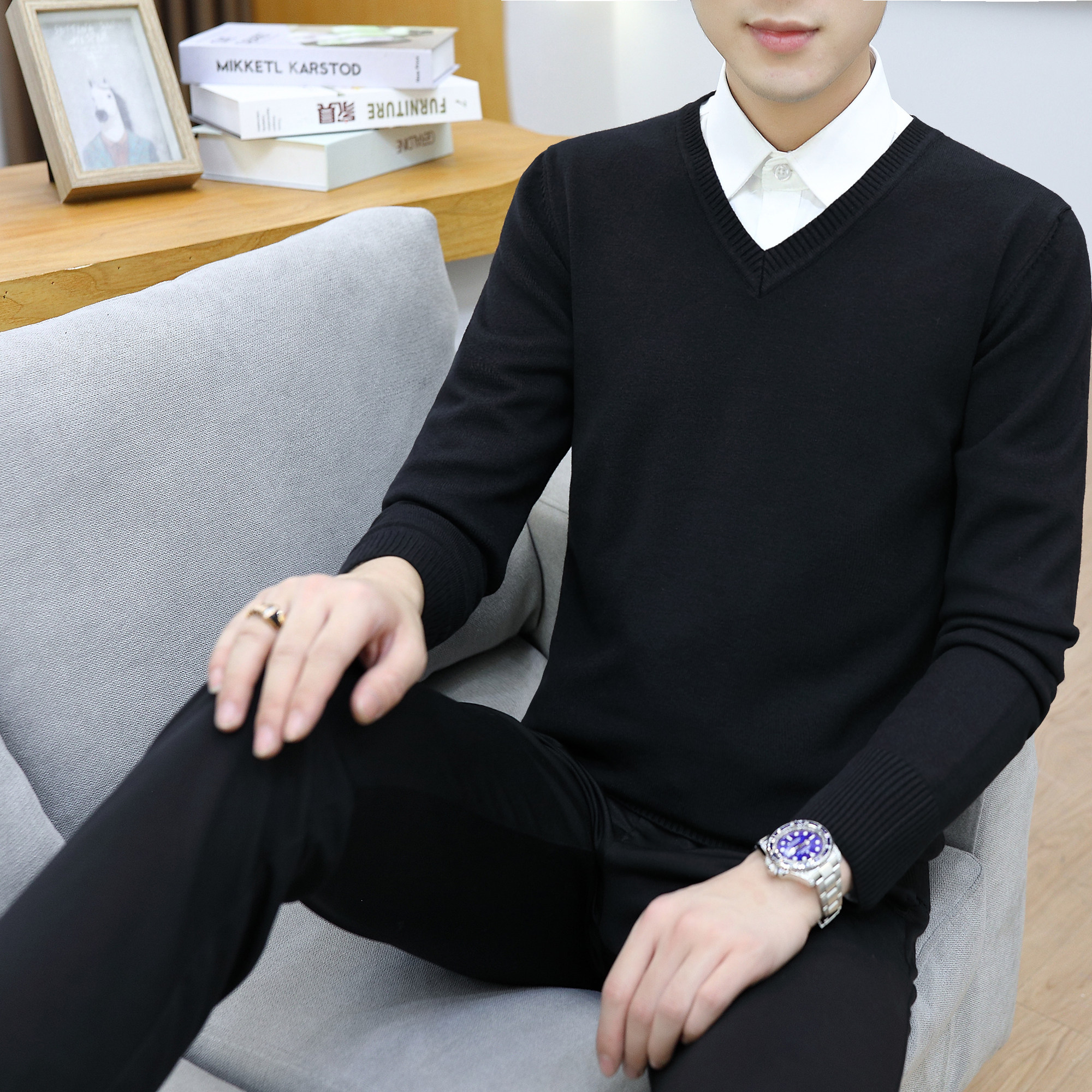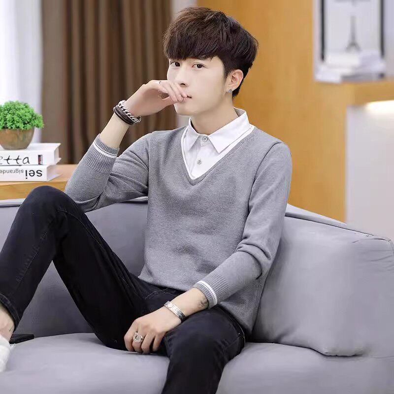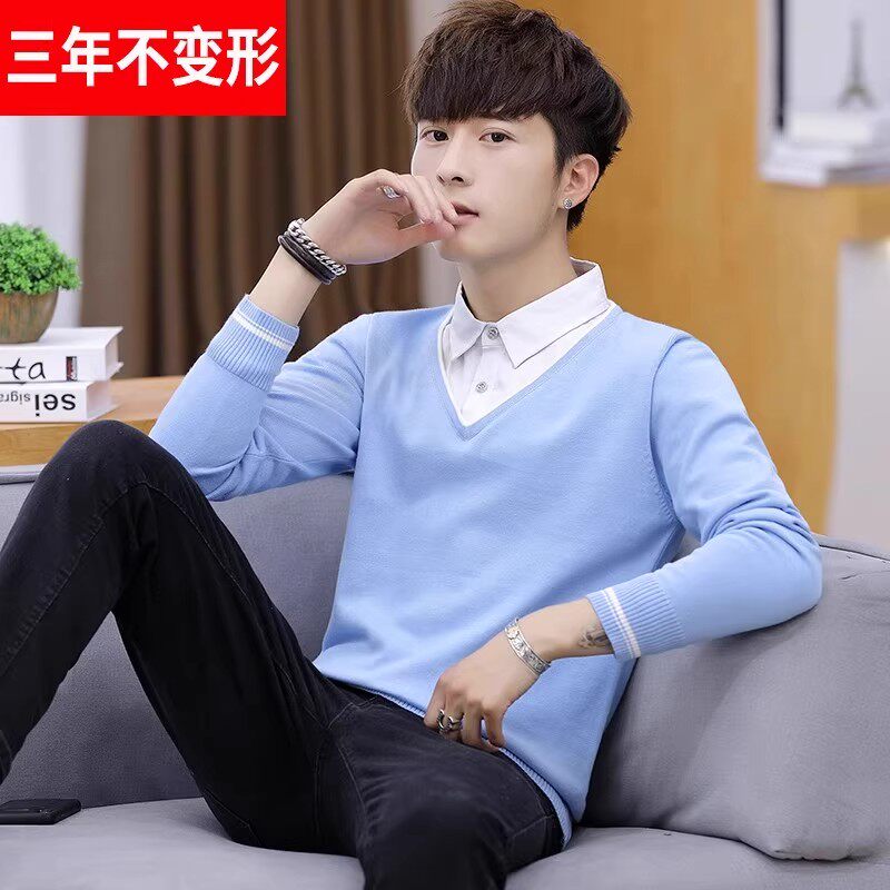 📚 假两件毛衣男装2025冬季新款衬衫领长袖针织衫修身百搭纯棉上衣男