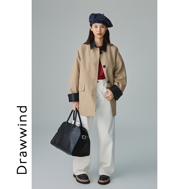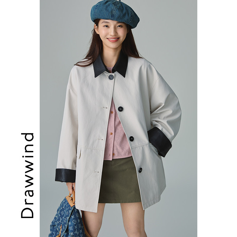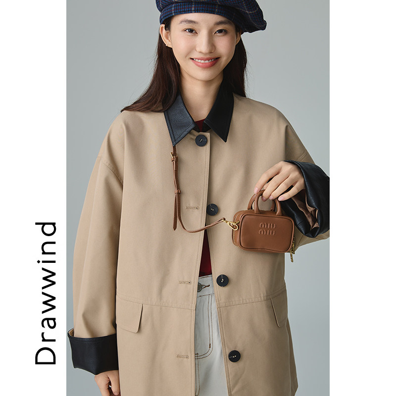 📚 画风drawwind复古拼接皮领风衣外套女2025新款秋季显瘦中长款大衣