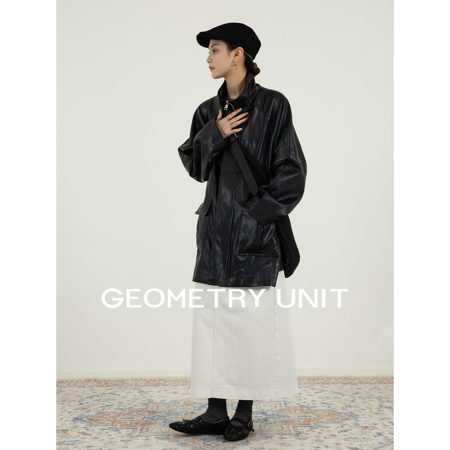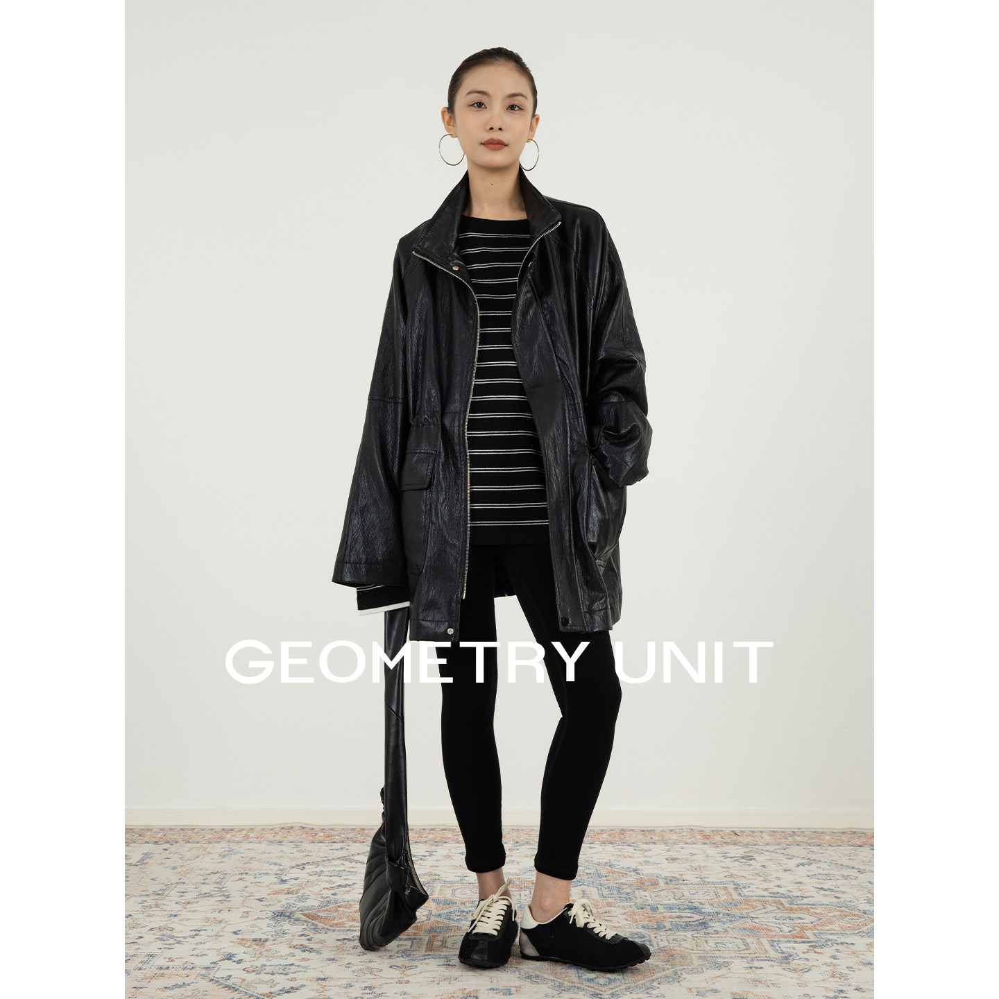📚 几何单元环保柔软PU皮外套春季中长款立领皮衣黑色收腰防风夹克女