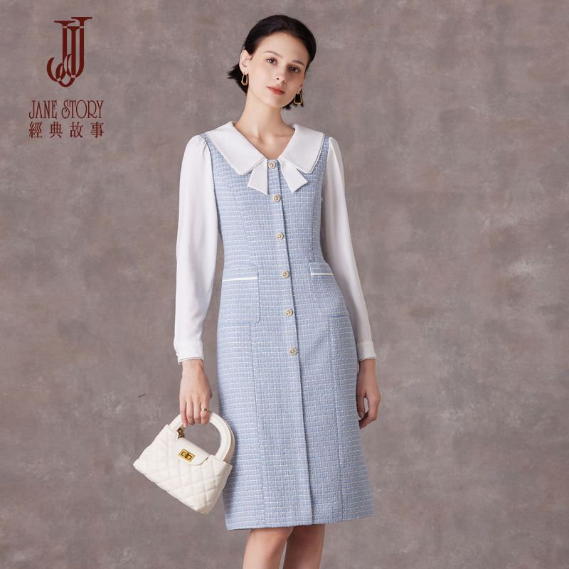 📚 蓝白色娃娃领连衣裙女2025秋冬新款时尚气质法式小香风收腰裙子