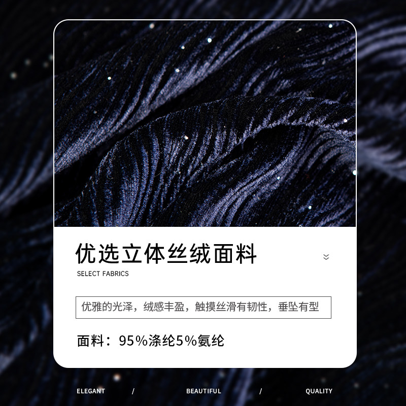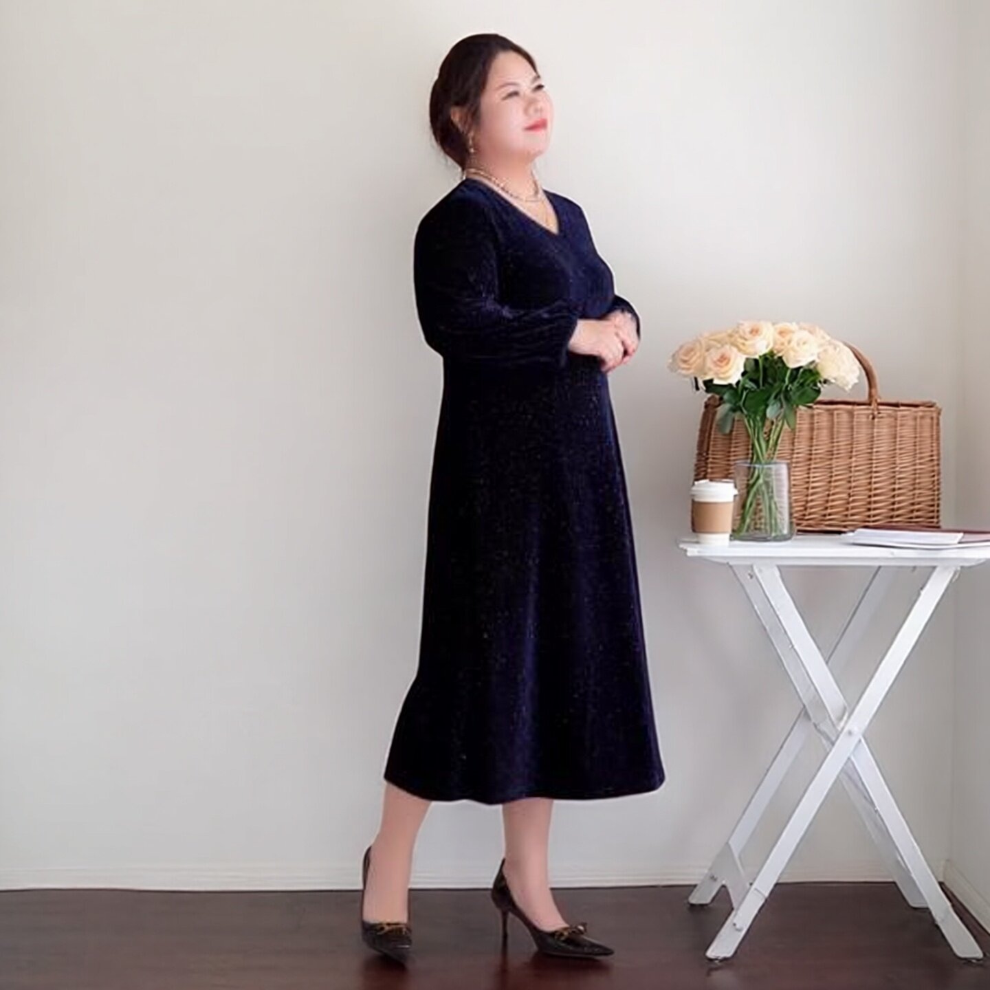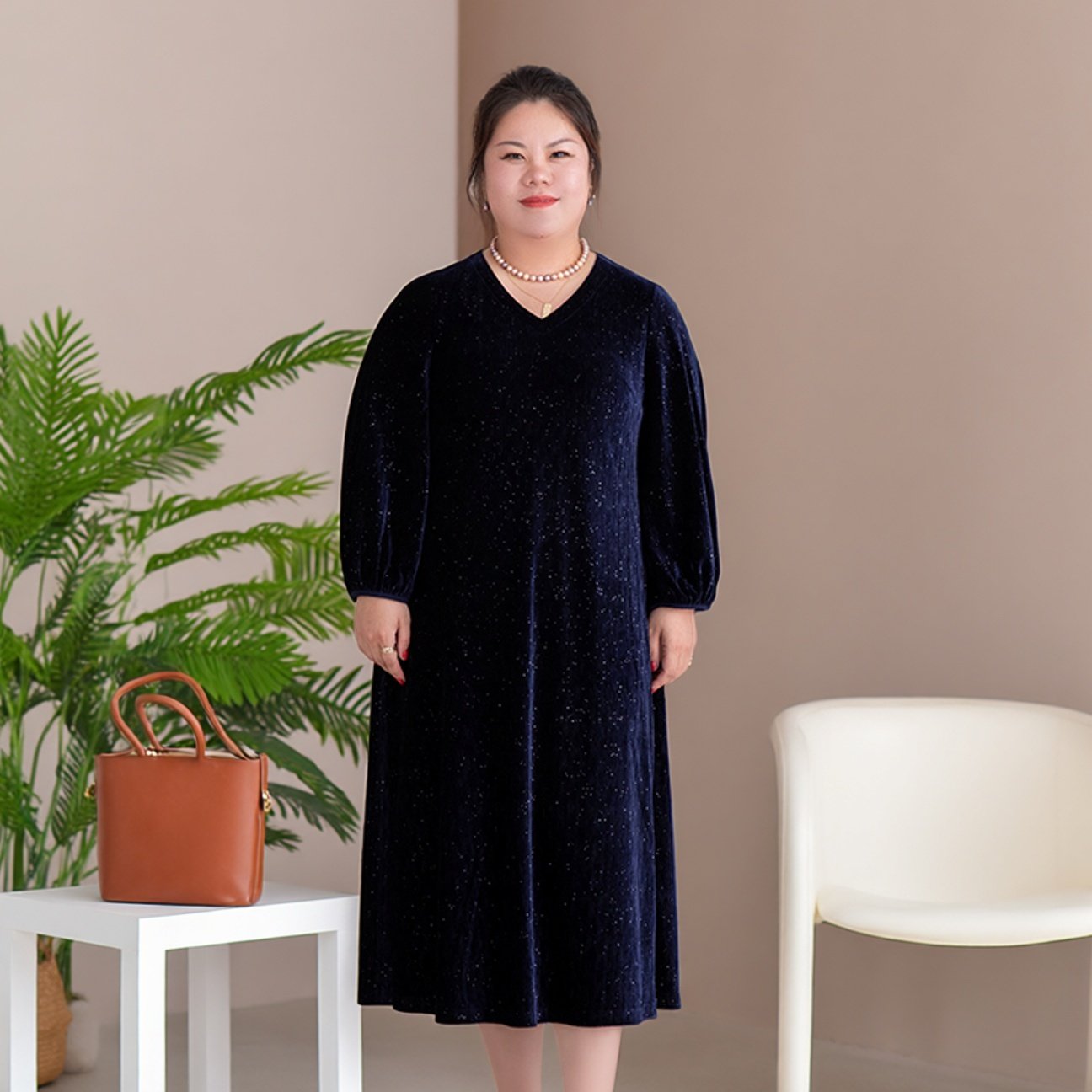 📚 美丽客栈高端大码女装高级感V领藏蓝色丝绒修身小A版中长款连衣裙