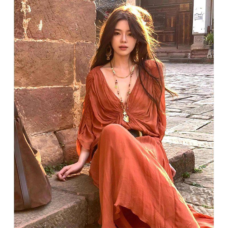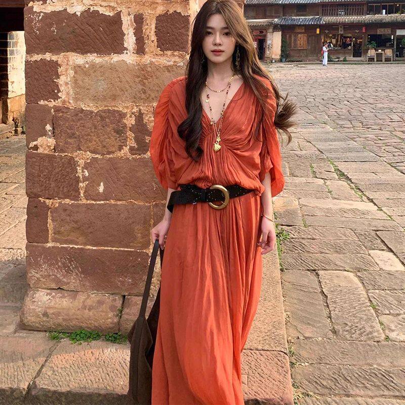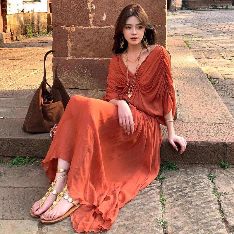 📚 沙丘风褶皱蝙蝠袖连衣裙艺术感看展晚礼服海边度假拍照沙滩裙