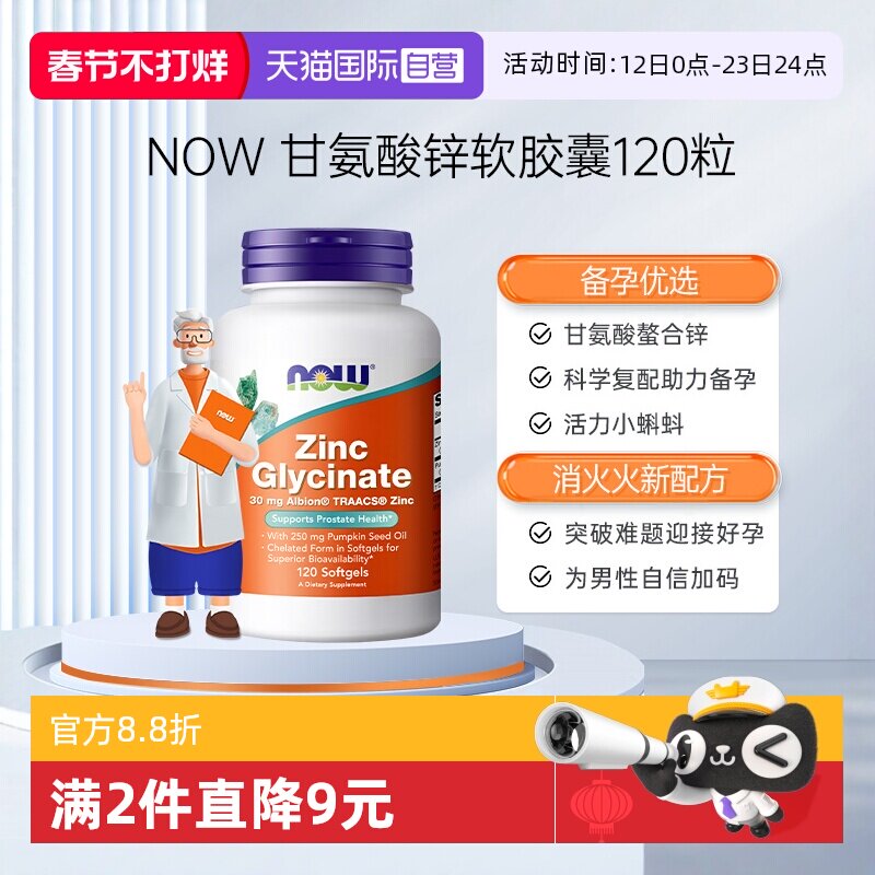 📚 【自营】NOW诺奥男性补锌甘氨酸锌zinc助力男士精子活力质量胶囊