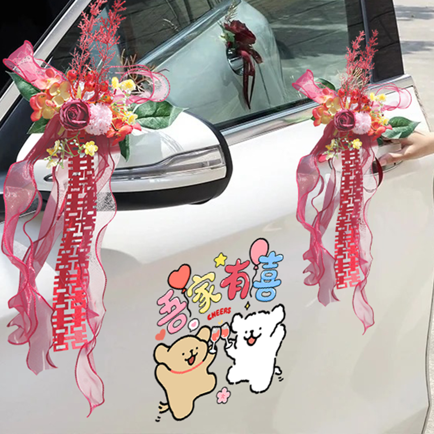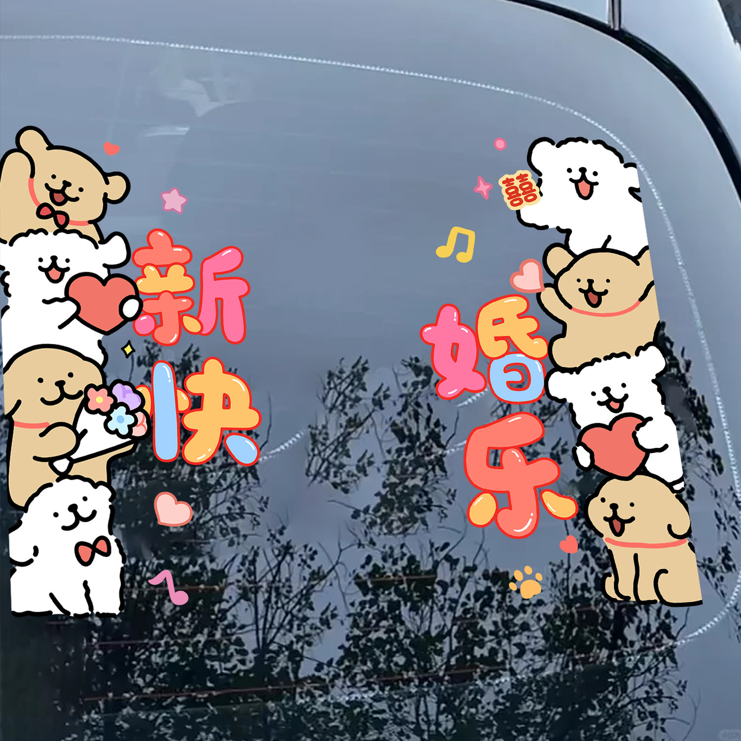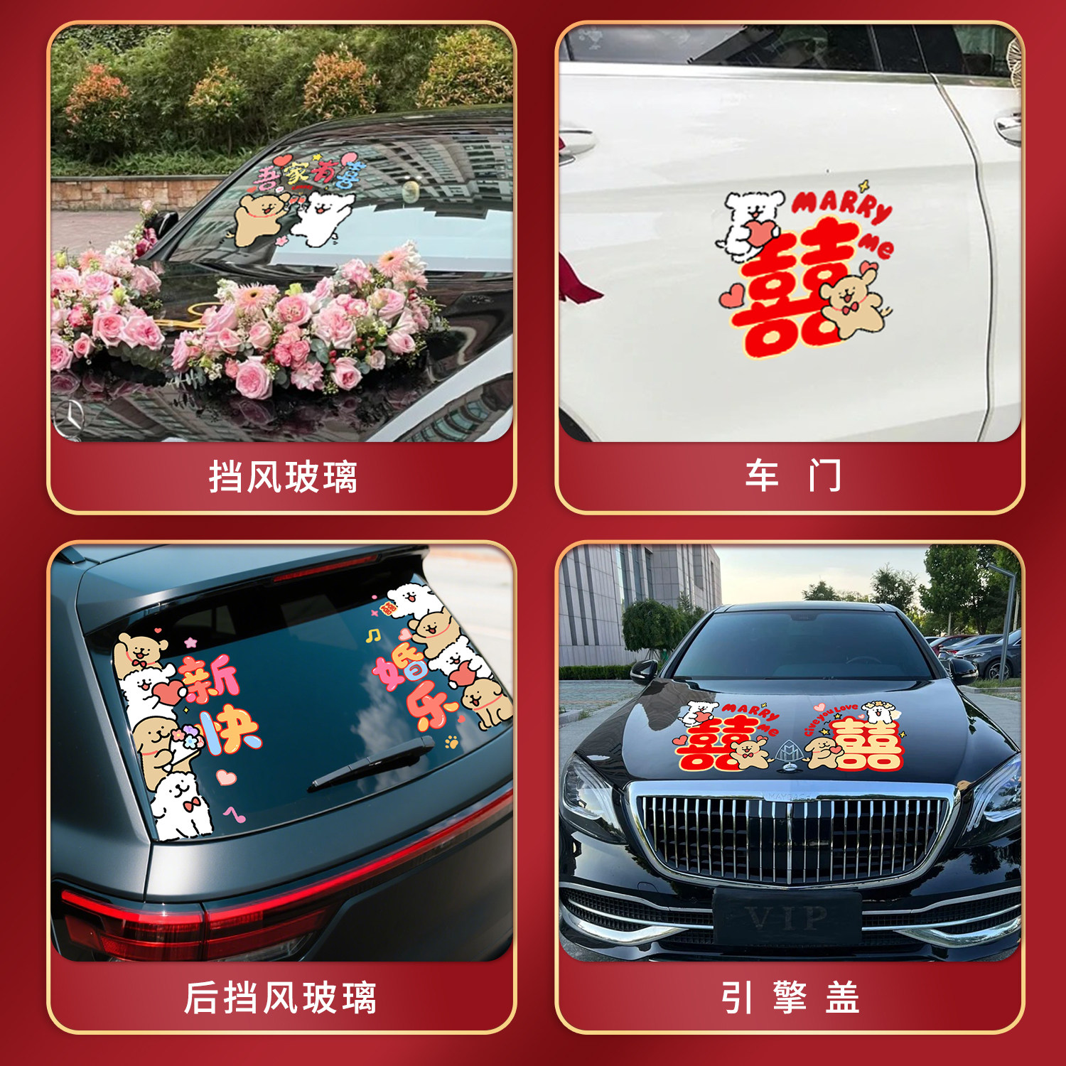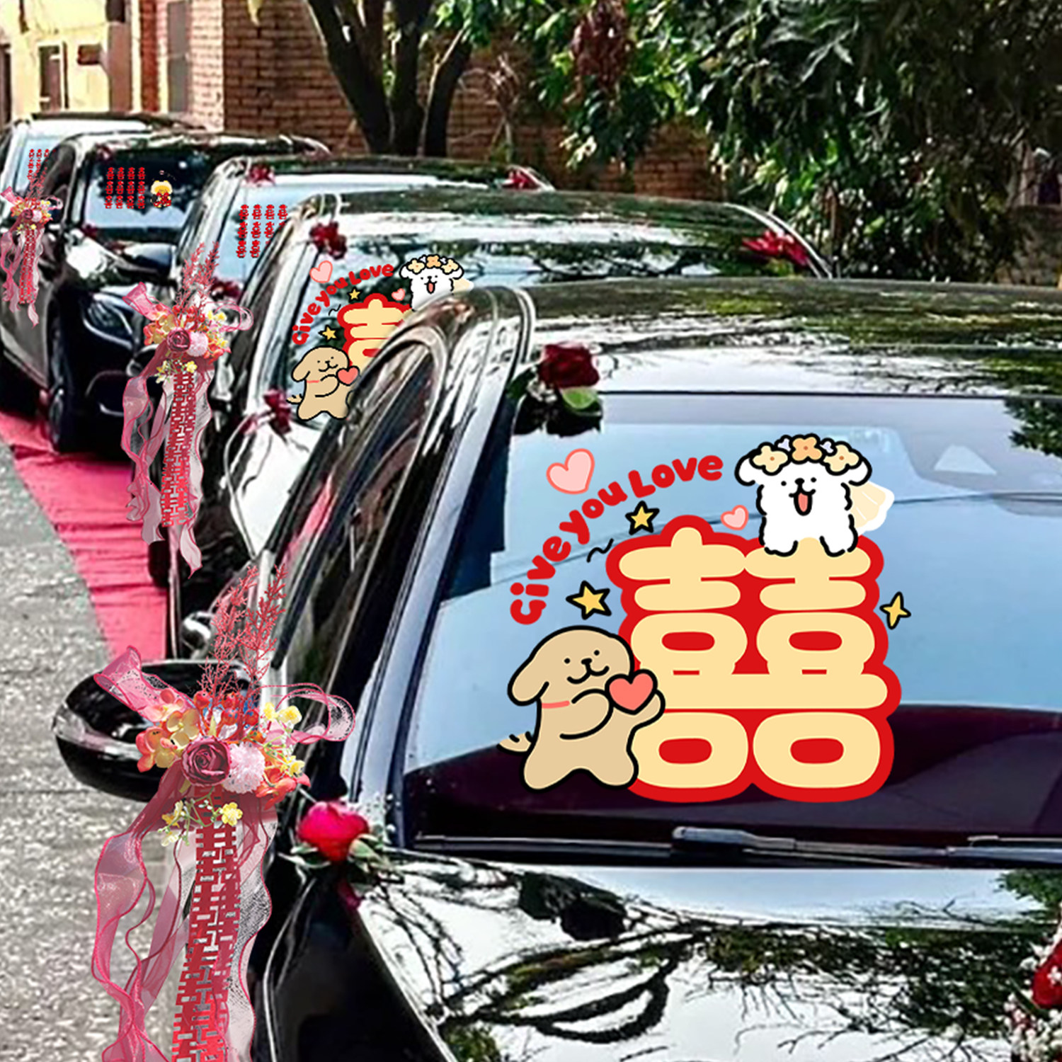 📚 婚车喜字静电贴结婚卡通囍装饰婚礼车队拉花线条小狗喜庆玻璃贴纸