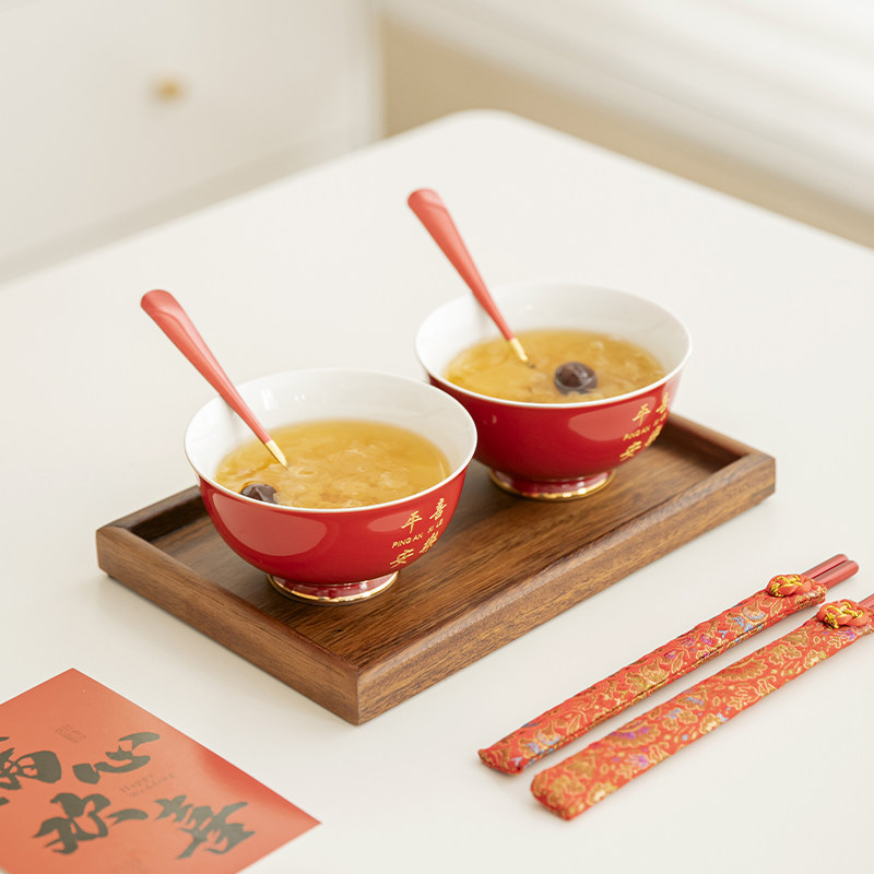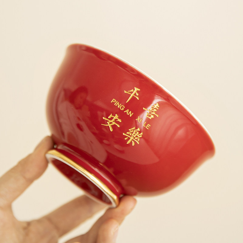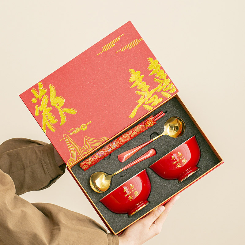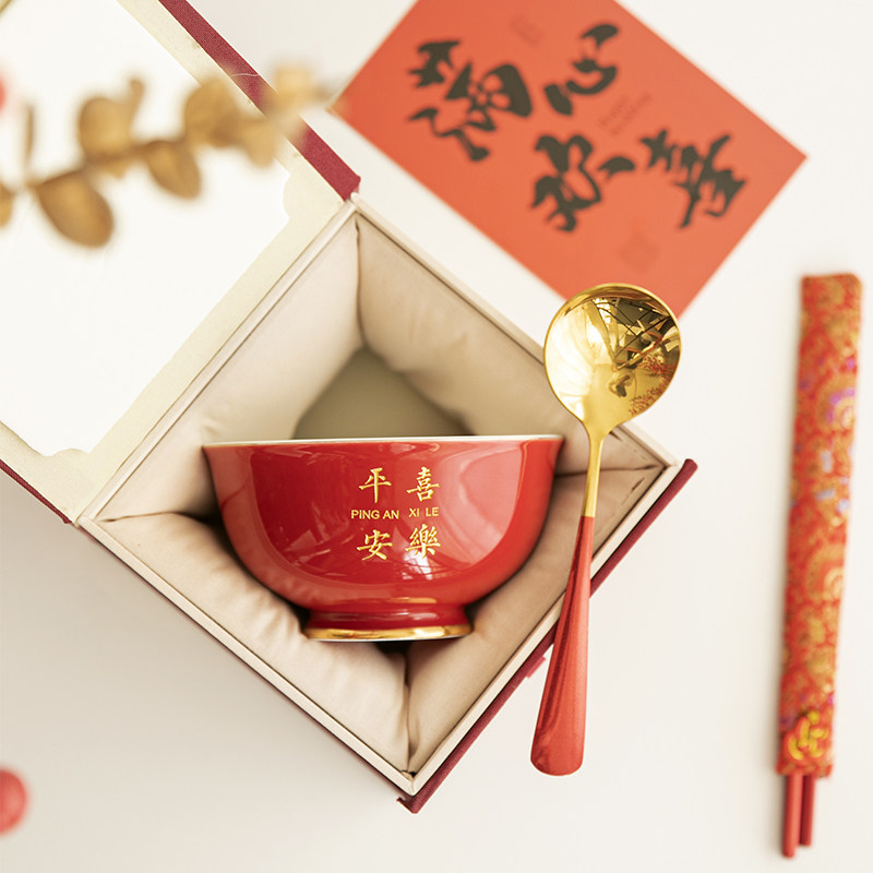 📚 乔迁之喜陶瓷餐具套装喜庆红高档礼盒刻字定制干亲礼宝宝周岁寿碗