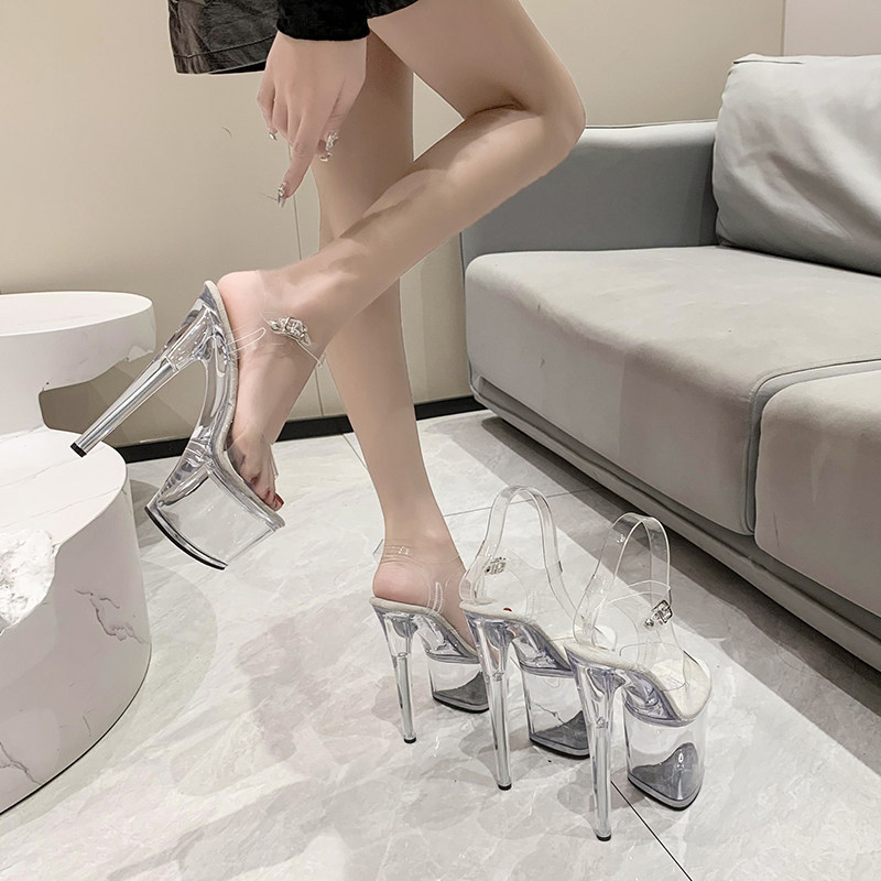📚 模特凉鞋真皮透明水晶鞋18cm细跟防水台超高跟20cm走秀舞台演出鞋