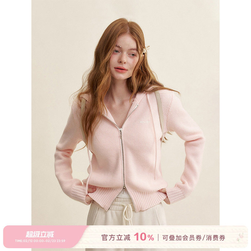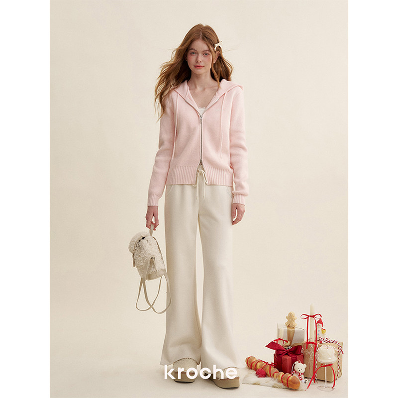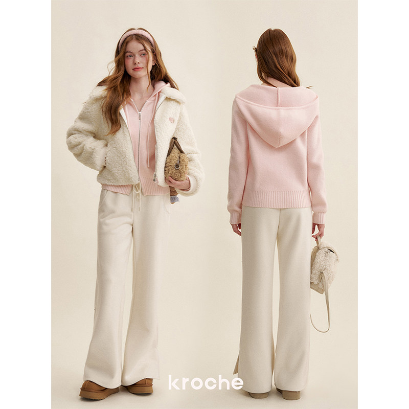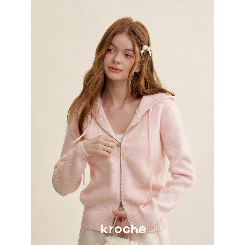 📚 Kroche 玫瑰奶油 羊毛混纺 撞色刺绣双拉链设计连帽针织外套