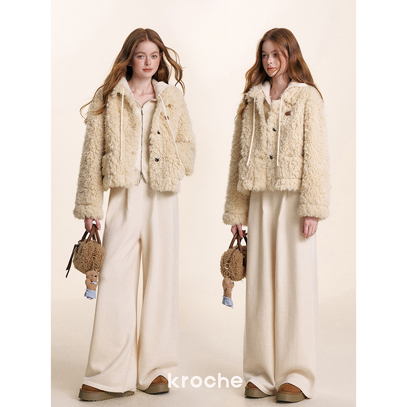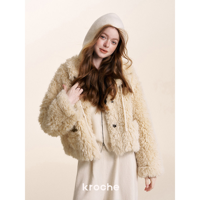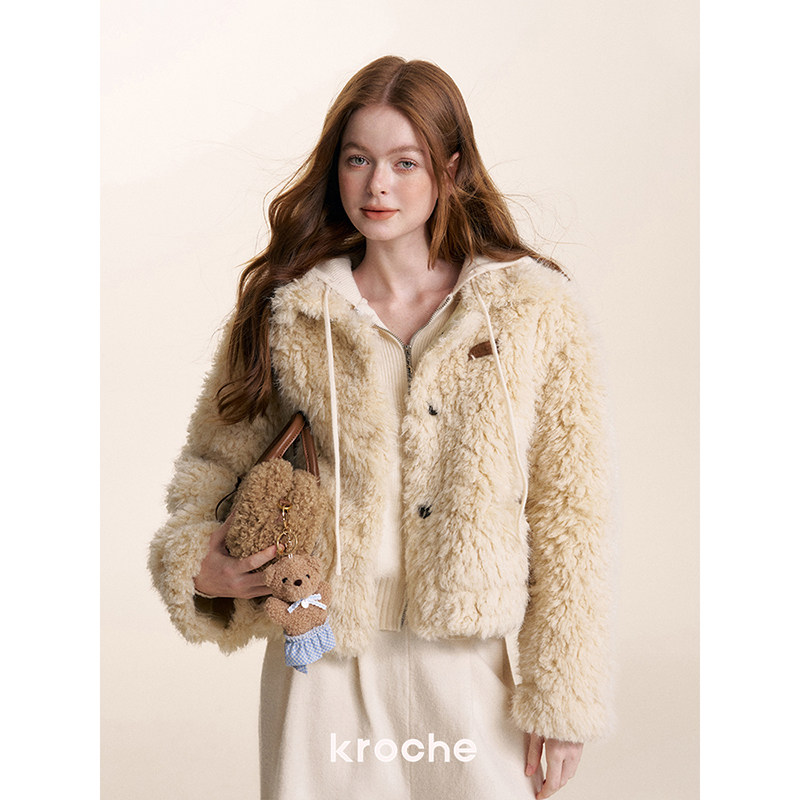 📚 Kroche 奶油泡芙 皮毛一体 卷毛泰迪熊短款羊羔毛过冬厚外套