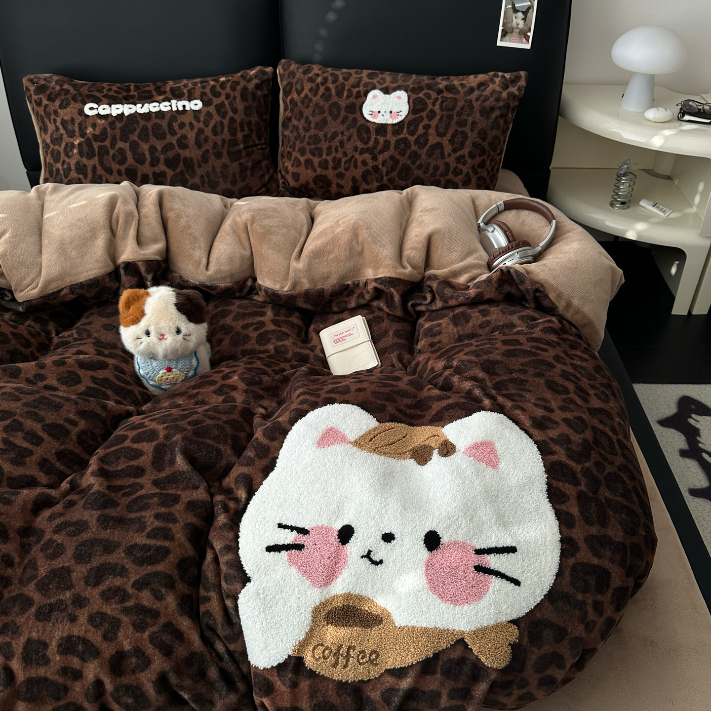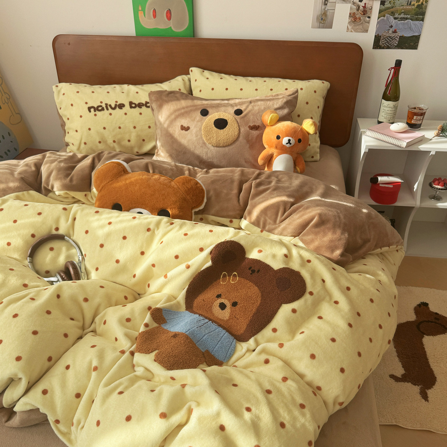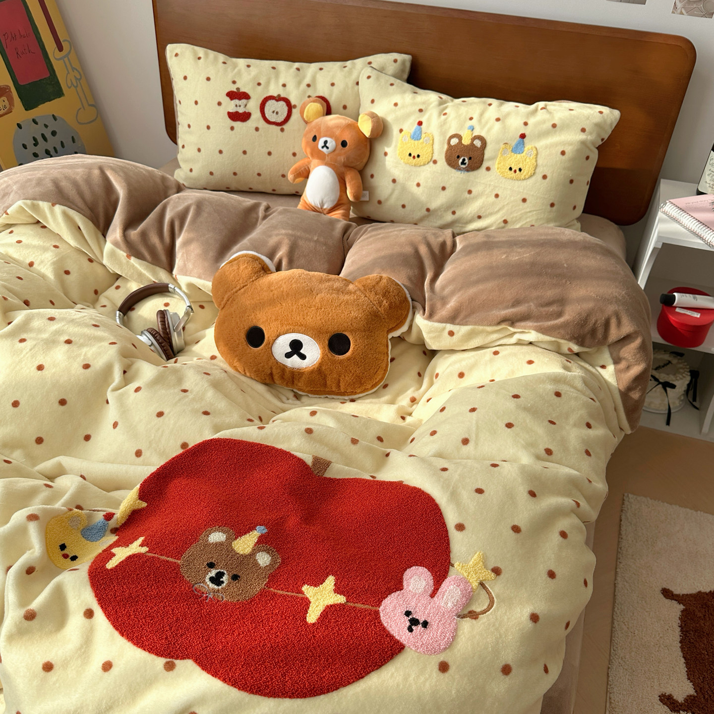 📚 晚安猫卡通苹果熊高克重牛奶绒四件套加厚被套宿舍三件套床单床品