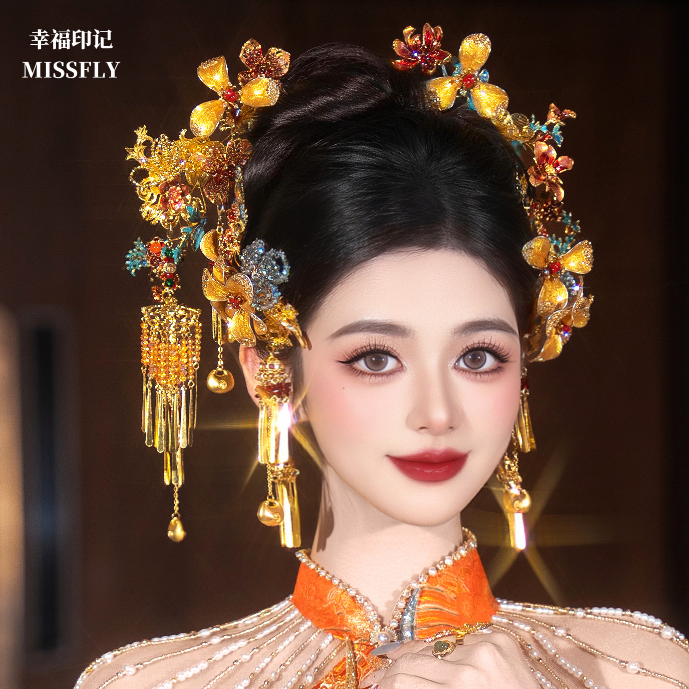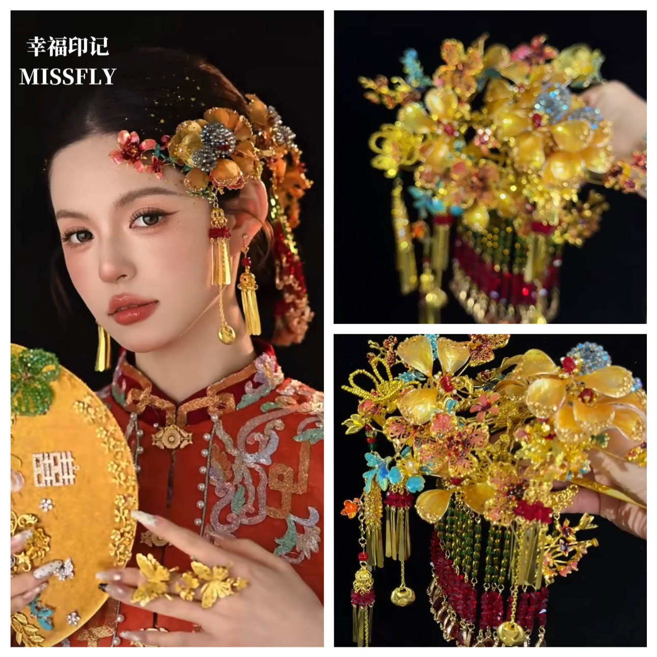 📚 新娘新中式秀禾龙凤褂头饰金红蓝花朵分体套装发饰高级感减龄百搭