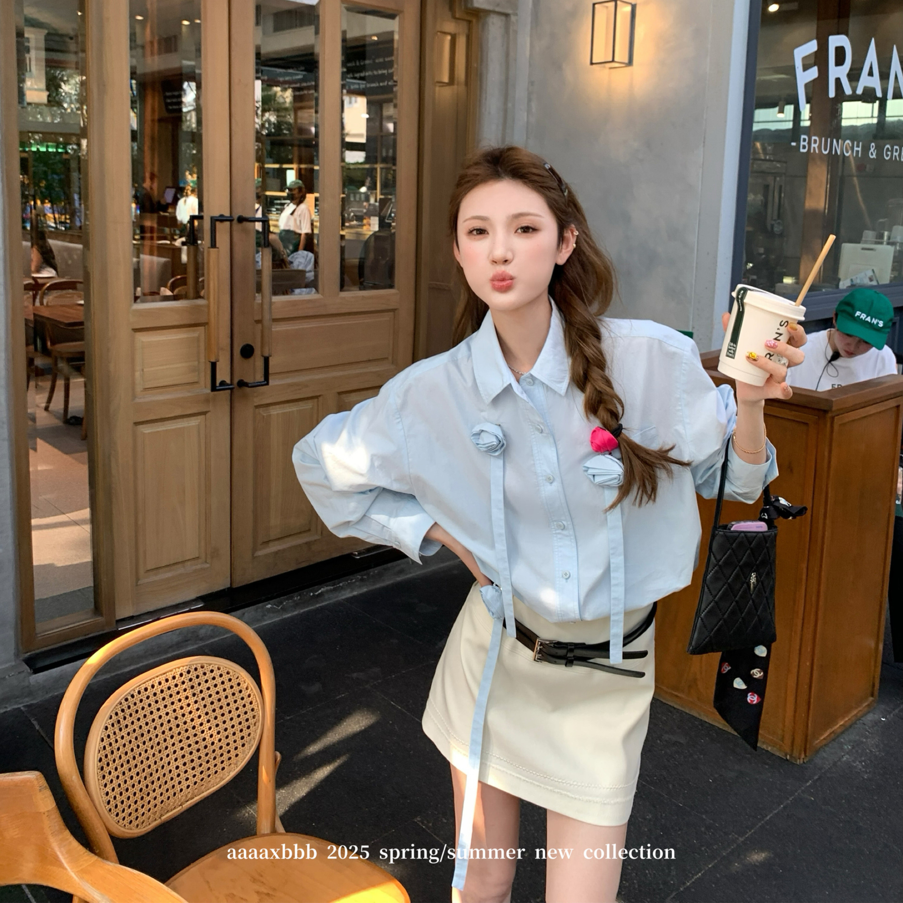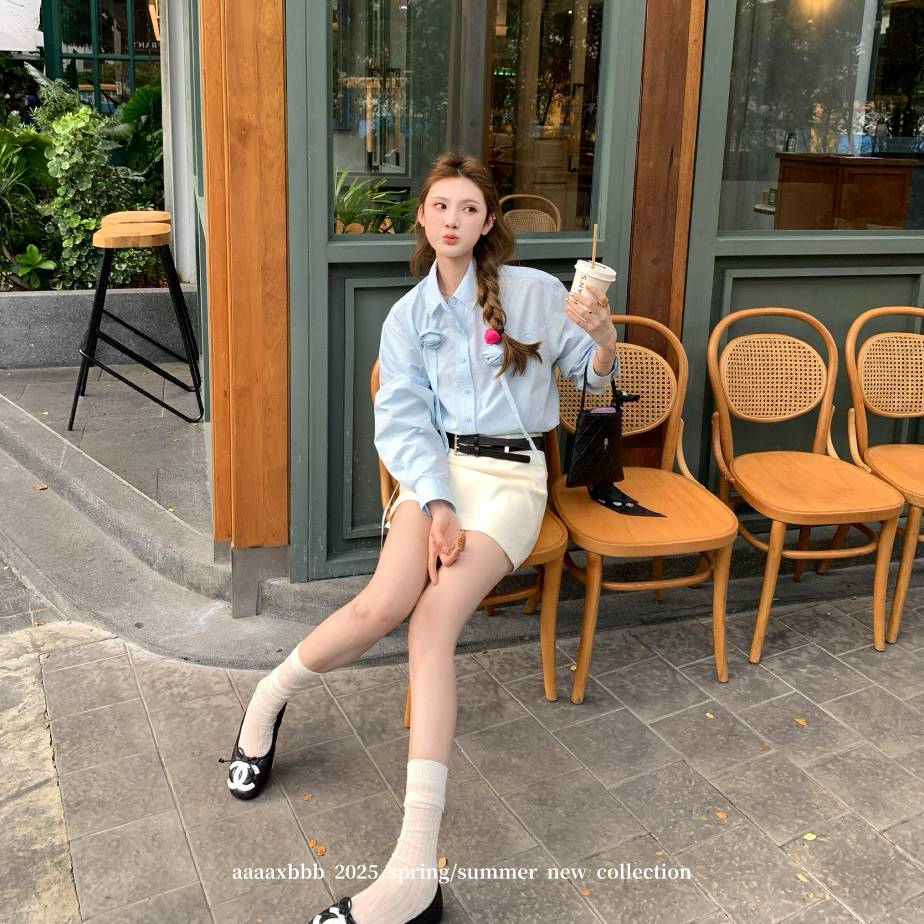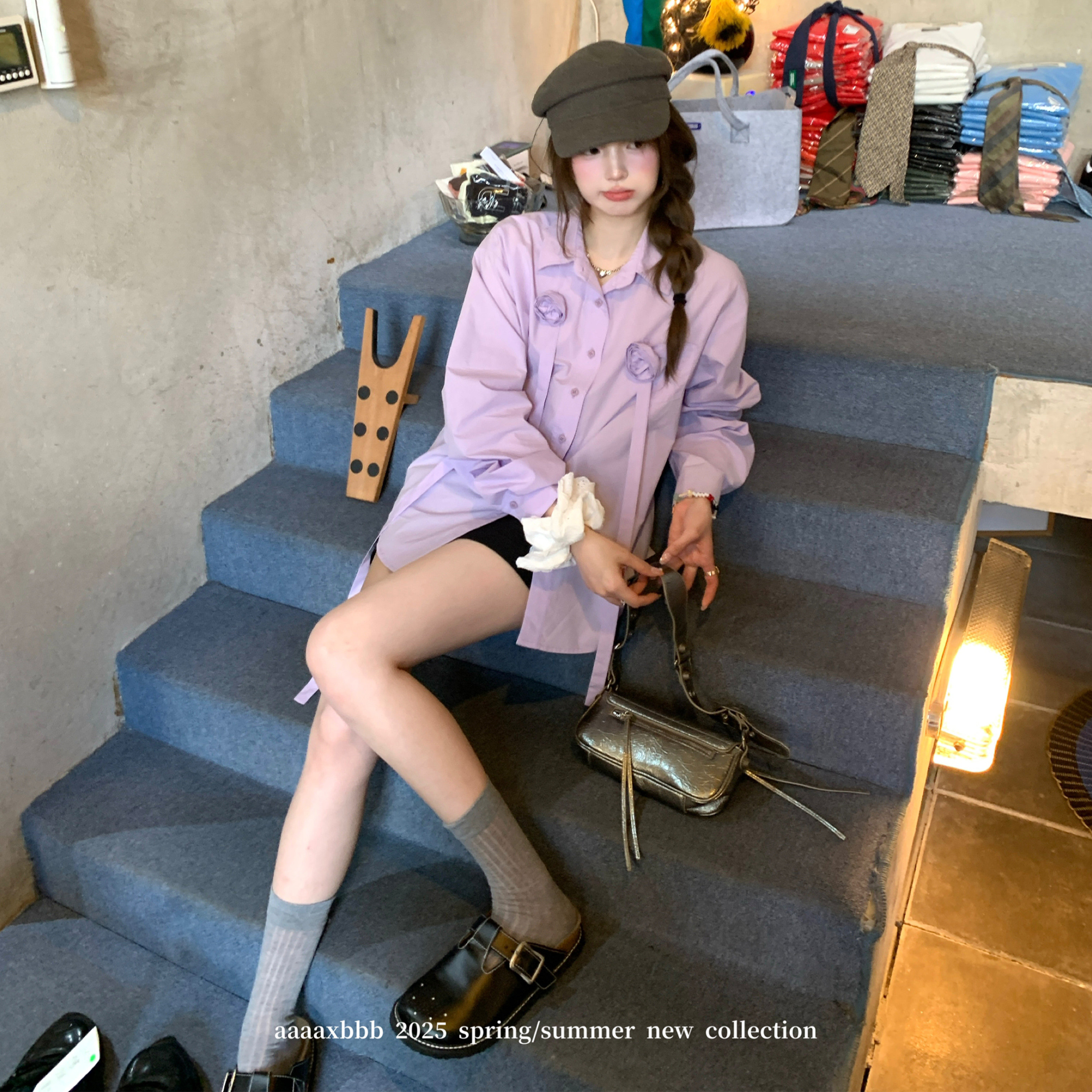 📚 aaaaxbbb 首尔私家花园 全棉订花紫/蓝色衬衫立体层次长袖上衣女