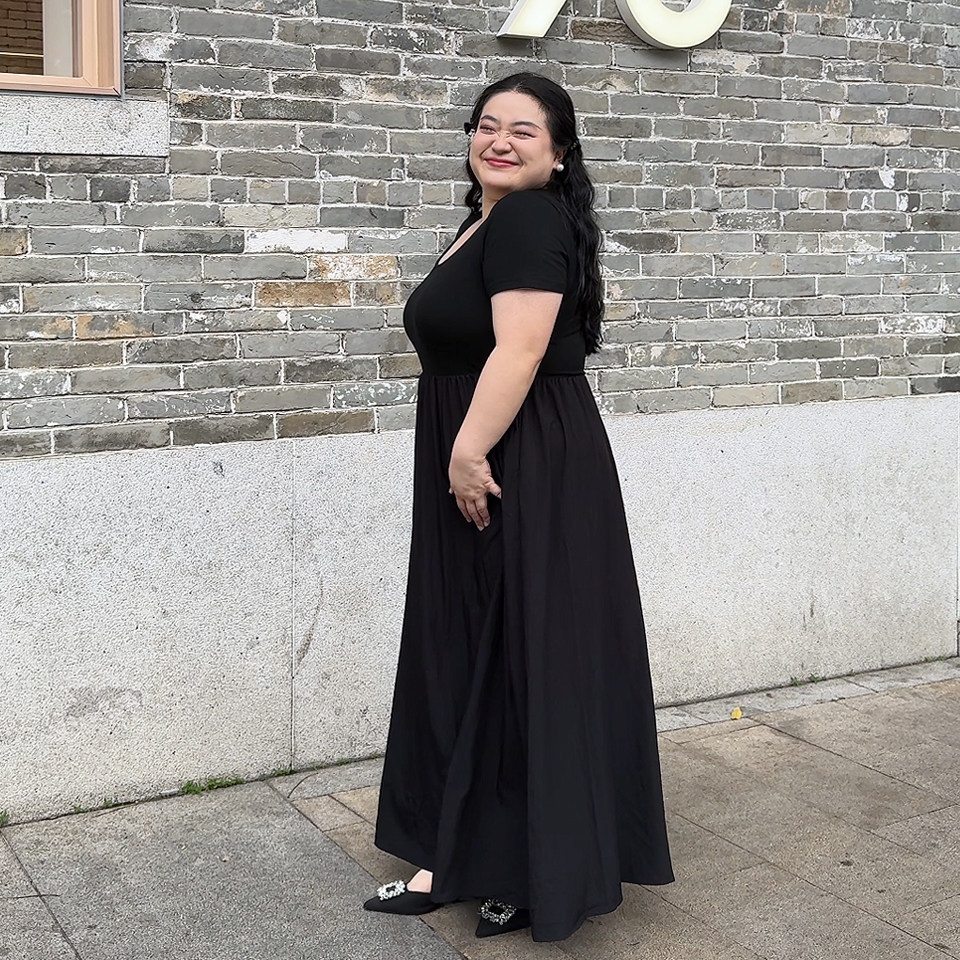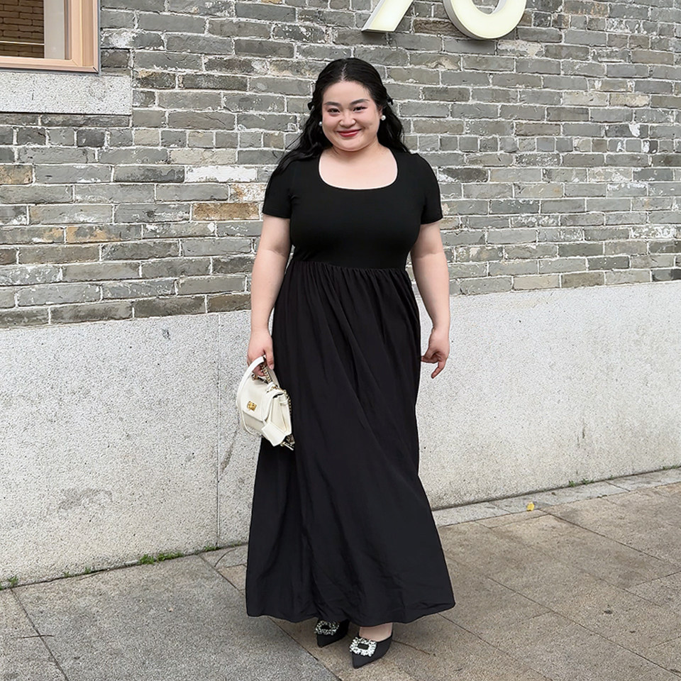 📚 福饮沸别【伏笔如墨】大码胖MM显瘦百搭黑色拼接连衣裙-2263