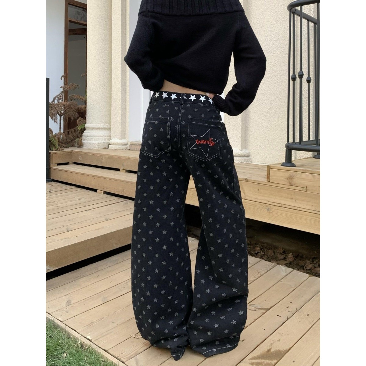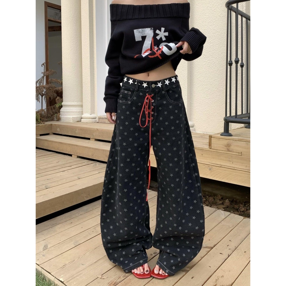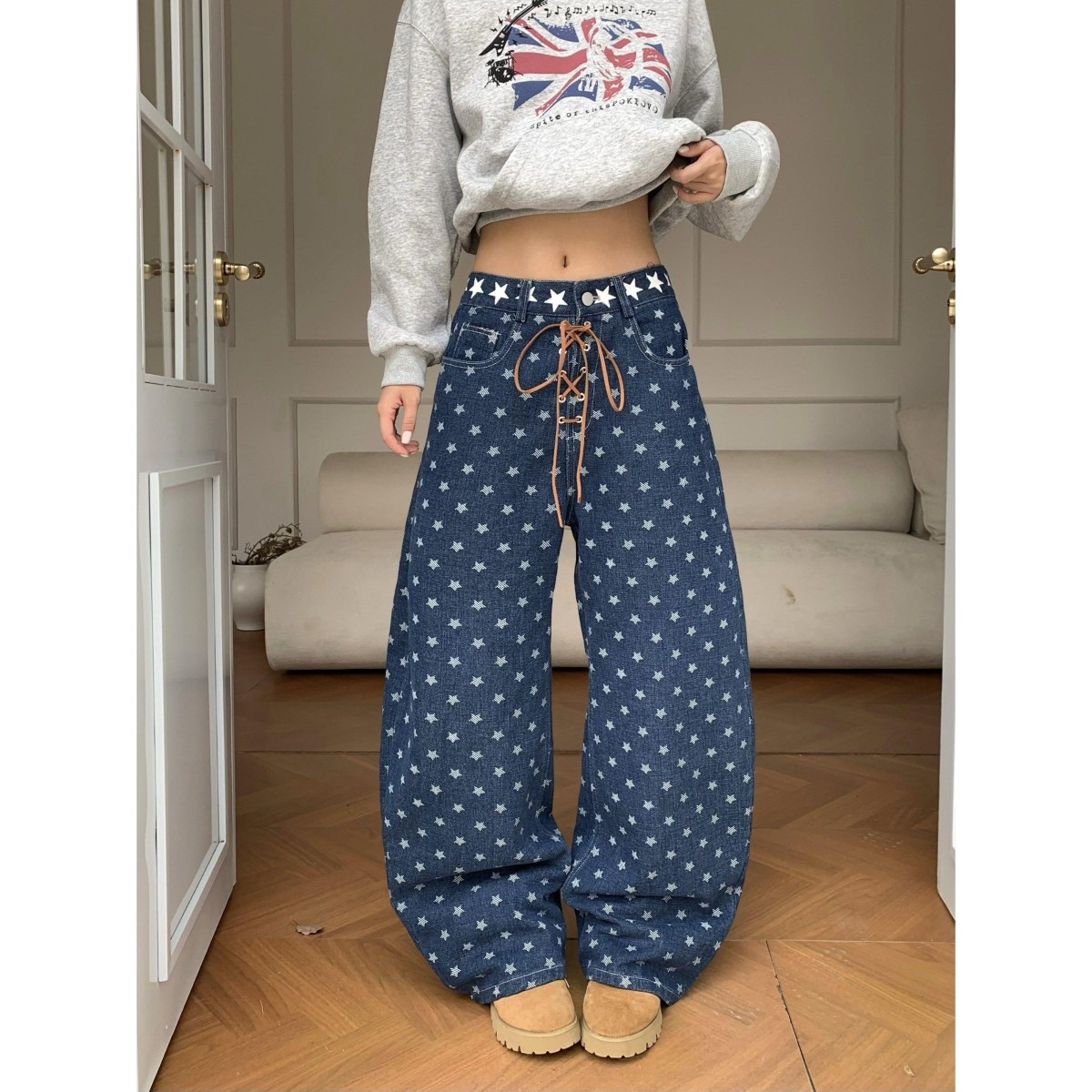 📚 美式复古星星满印绑带弯刀牛仔裤女秋季新款设计感显瘦直筒拖地裤