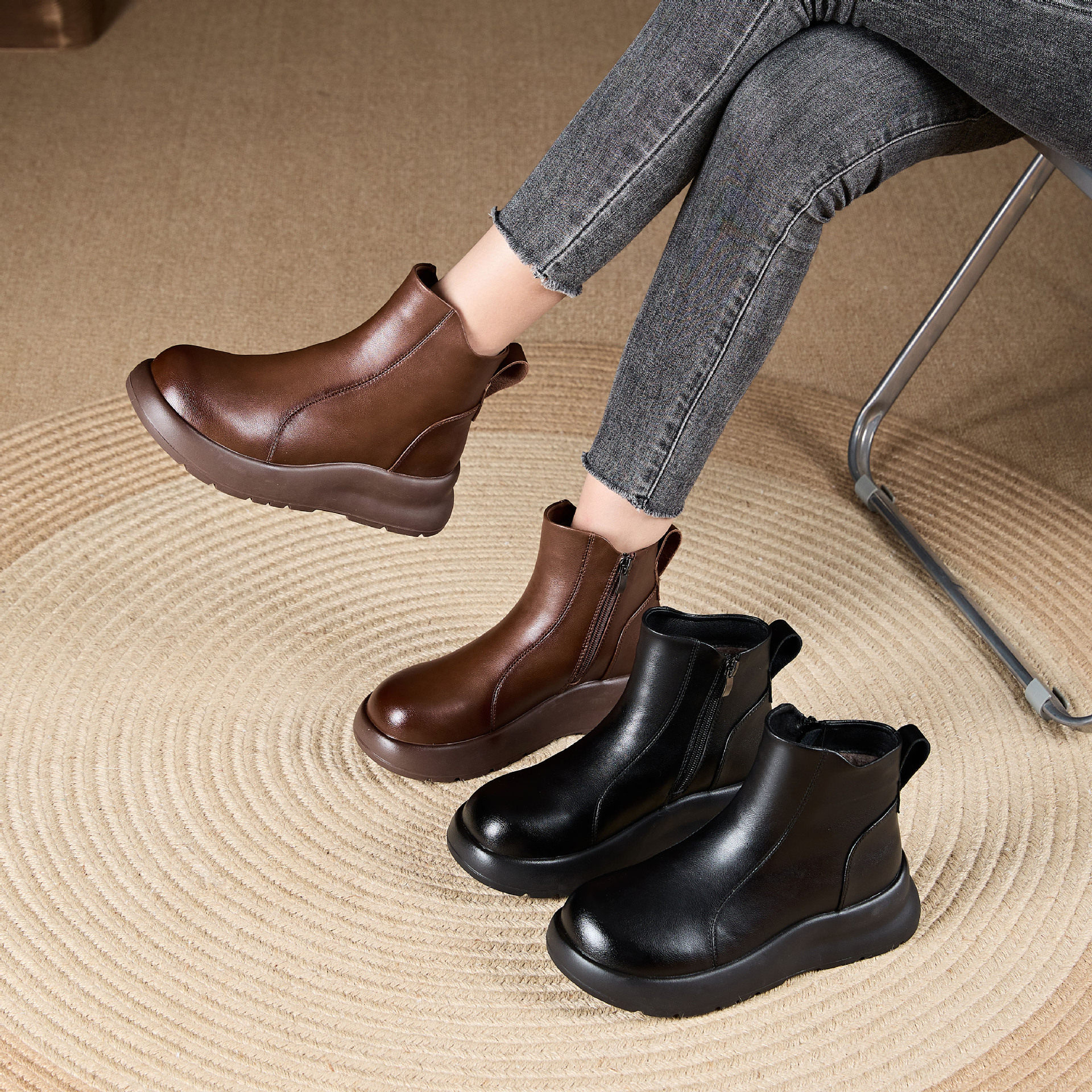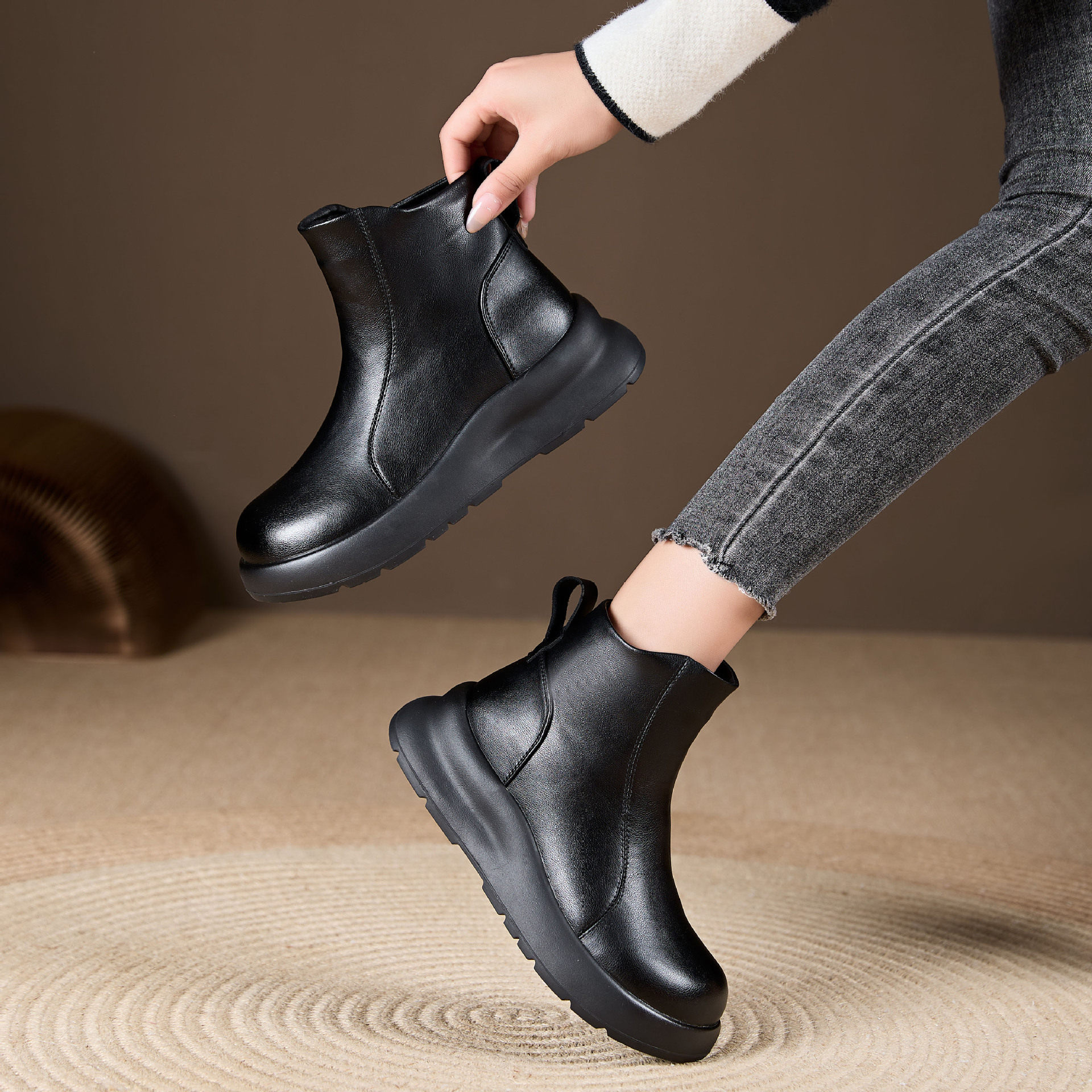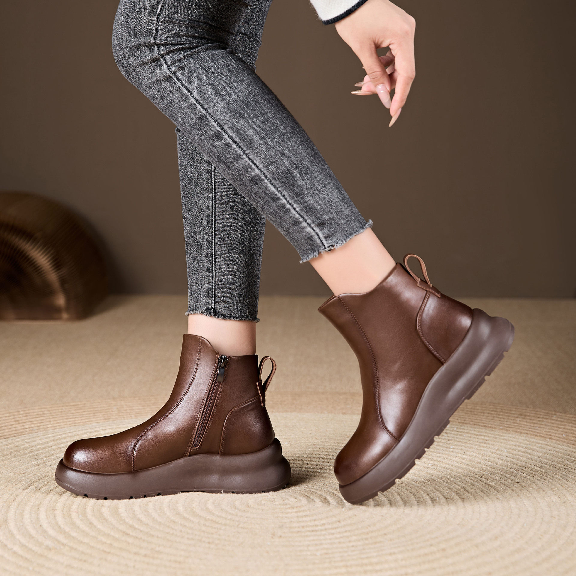 📚 厚底真皮休闲短靴女鞋24年秋冬新款复古时尚百搭马丁靴切尔西靴