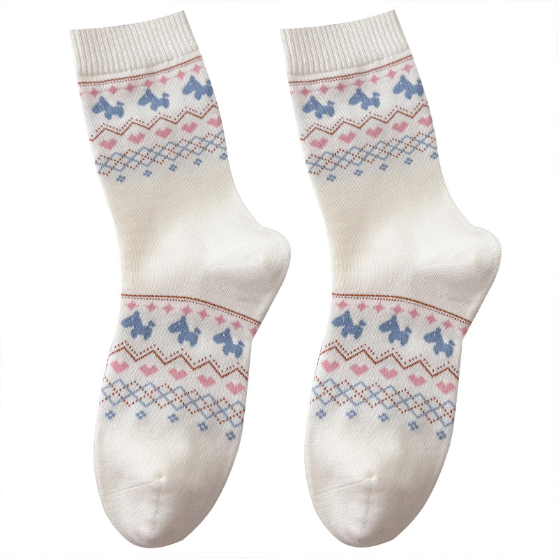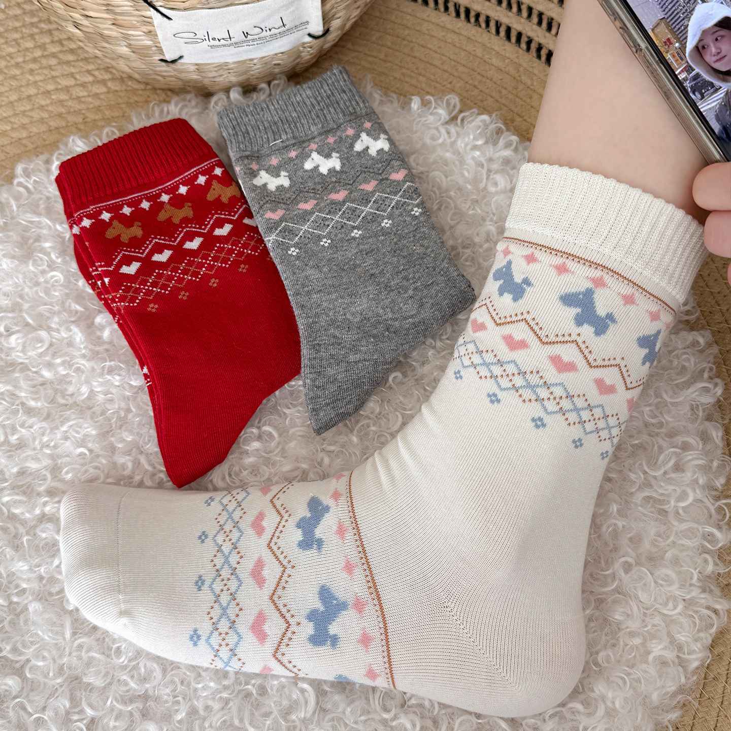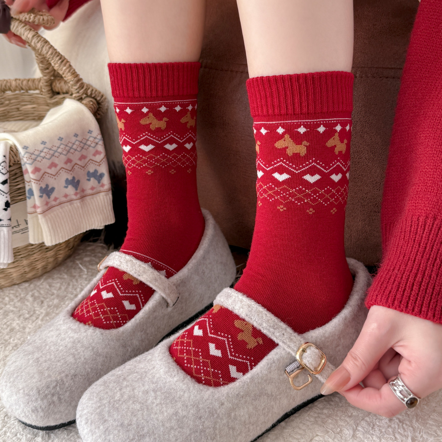 📚 复古费尔岛袜子女中筒袜秋冬纯棉可爱卡通2026马年大红袜长筒袜