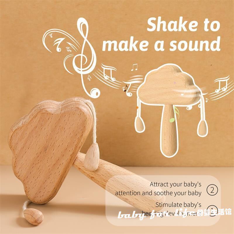 📚 新生婴儿榉木云朵拨浪鼓玩具可啃咬木质手摇铃0-3岁满月百天礼物