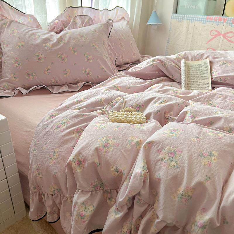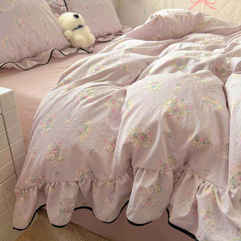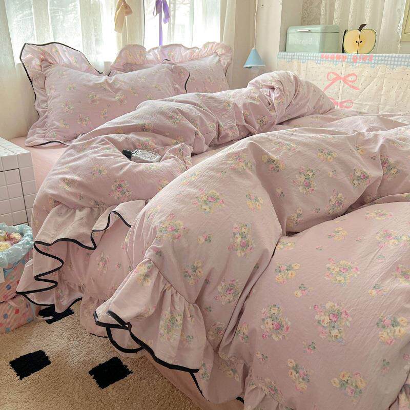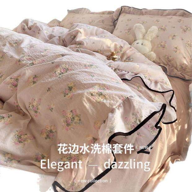 📚 小清新云感针织棉大花边超软四件套床笠款被套床单学生宿舍三件套